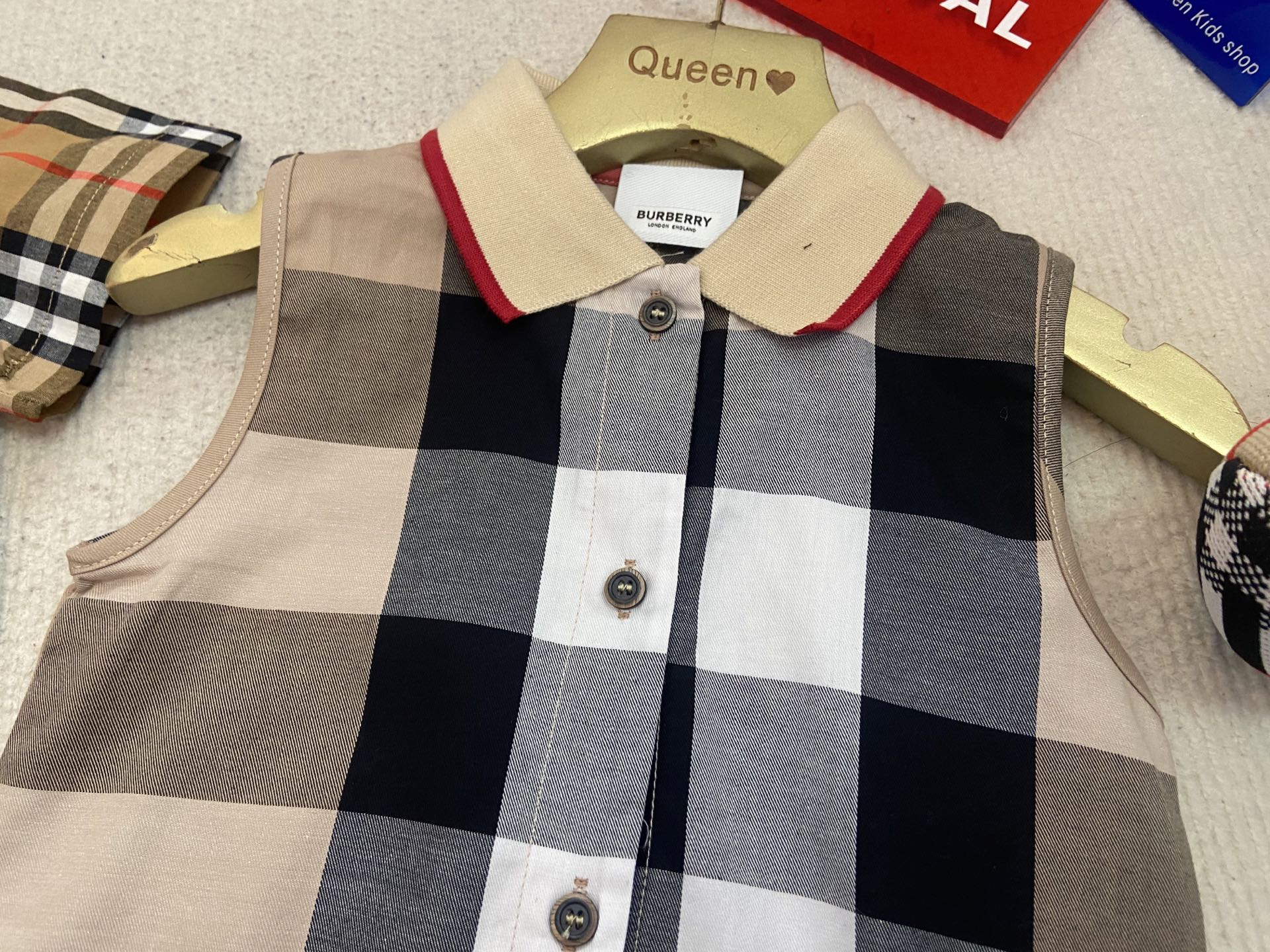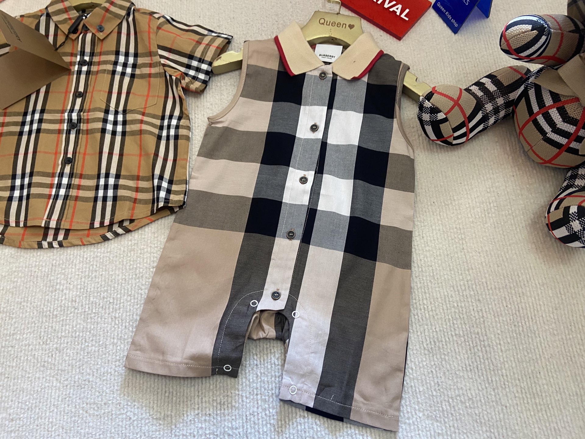 Book for one week! Burberry, a high-end children's wear set for boys and girls, is a two-piece set: a checked shirt and a vest jumpsuit. Made of pure cotton woven fabric, it is comfortable and good-looking to wear. Size: 59-66-73-80-90cm