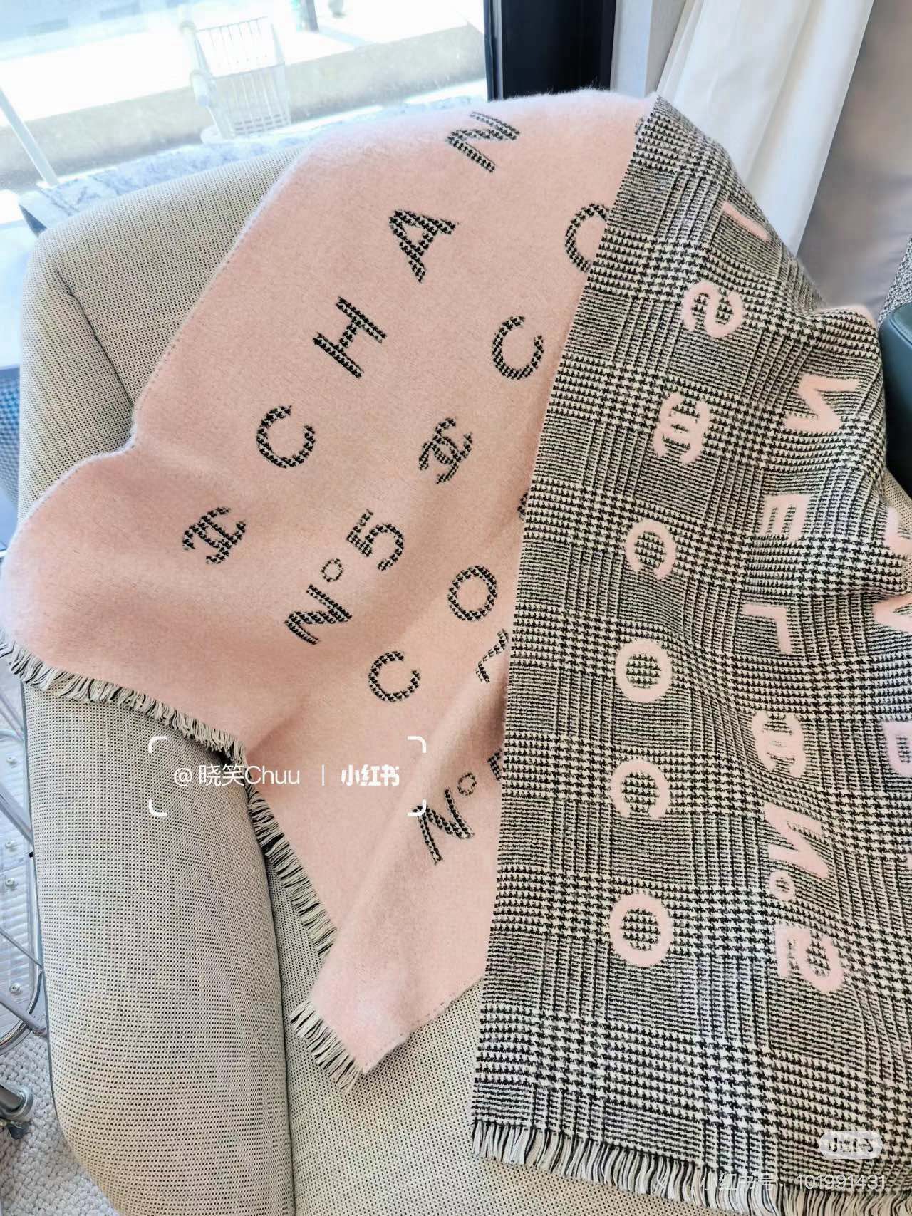 This is the latest Chanel 24cocoChanel collection from Chanel. It's the same style as Zhang Yuxi's scarf and is hailed as the most beautiful one from Chanel in 2024. It's the most worth getting. With a checkered pattern on one side and jacquard letters on the other, it serves as both a shawl and a small blanket. It looks great when worn casually. It's extremely beautiful. The coco collection has been brought to the fullest by designers, breathtakingly beautiful and timeless ? ? This Chanel style, the more I look at it, the more I love it, the more fashionable it is, the more I like it, very substantial and drape, incredibly good shape ?? Incredibly beautiful, incredibly comfortable to hold in hand ?? Purchase price 10,000 ? one piece, 100% cashmere fabric, soft and skin-friendly, size, 74.4x194.4cm with tassel length