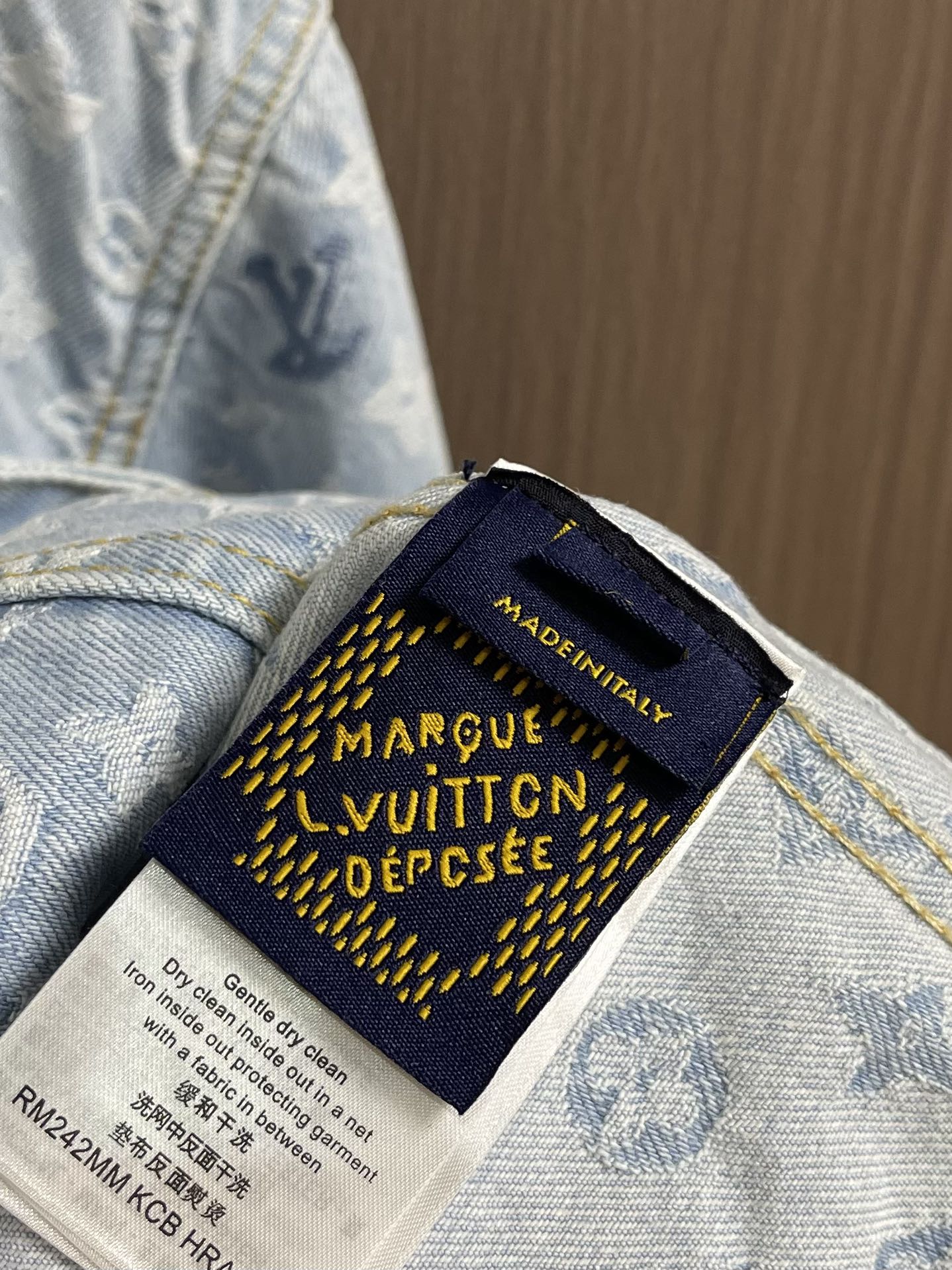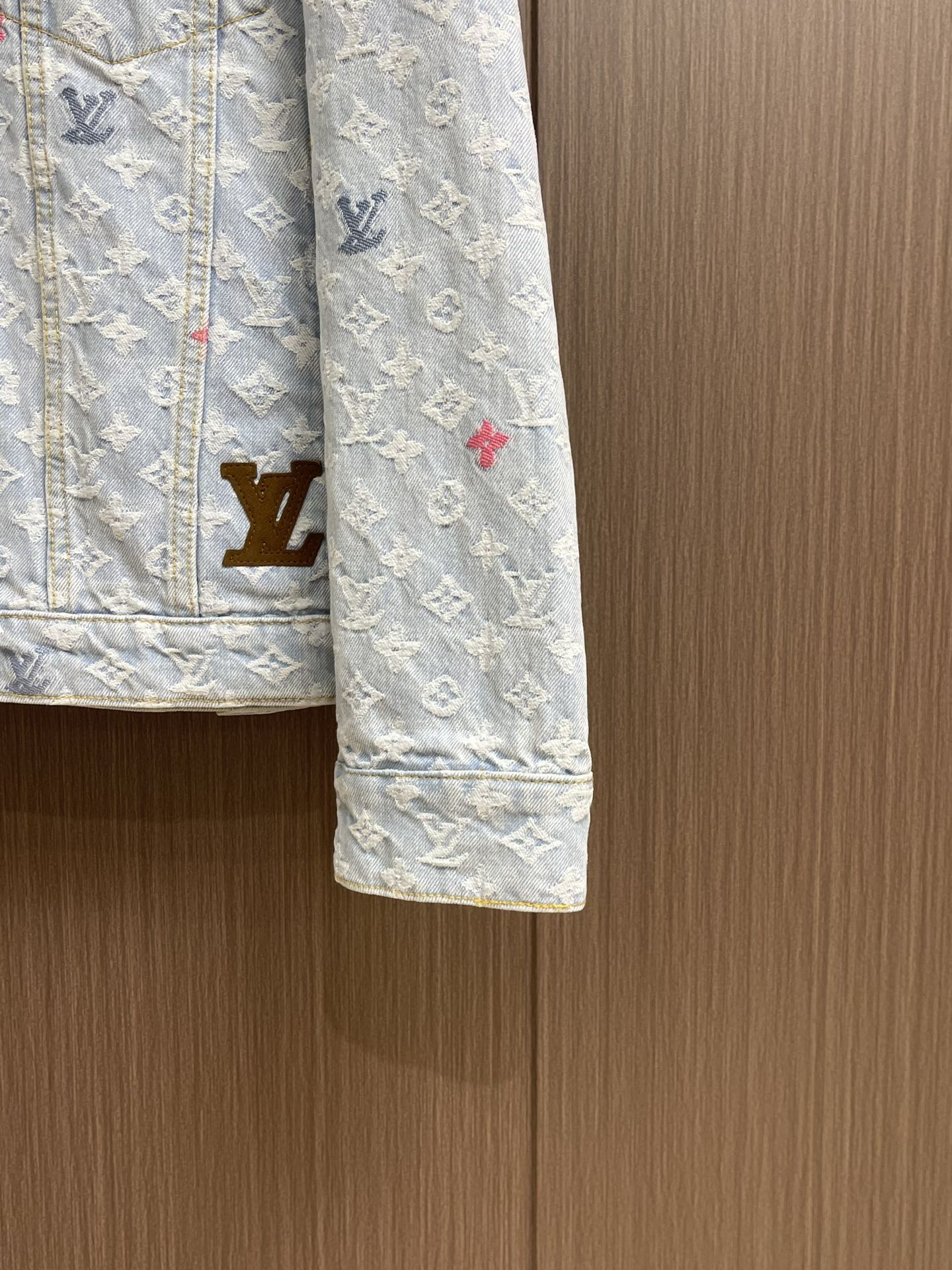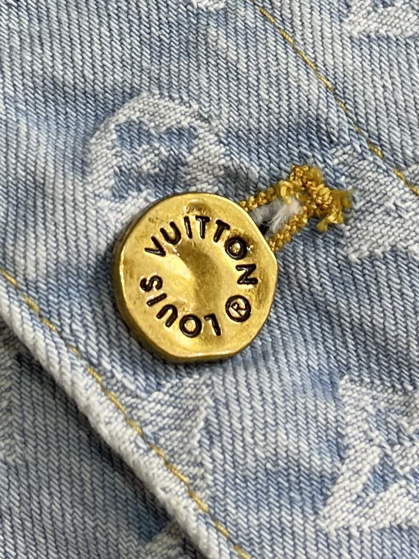 Top and jeans LV 2024ss tyler Collaboration Embroidered Long-sleeved Shirt and Jeans Set, tyler collaboration series. The original version is made of twill cotton jacquard denim material. The size and spacing of the jacquard patterns are the same, and the width of the patterns is consistent, giving it a rich texture. Washed and aged in a retro light blue color, the overall decoration is decorated with old floral patterns. After weaving, it is done with positioning color embroidery (blue, pink, yellow, fluorescent green). Four colors of yarns are adjusted multiple times to achieve perfect color matching. The monogram full logo and macaron candy-colored embroidered logo are both fashionable and high-end in craftsmanship. After the finishing process is completed, it enters the washing water. Spray the horse to make the fabric naturally fade and present a whitening effect. The back waist leather plate features a color-matched iron mold pattern and is made of genuine top-grain cowhide suede. The threshold is equipped with 1 large and 4 small process buckles for opening and closing with baked paint hardware buckles. The back pocket is made of suede color-matched mold suede badges. The entire set of new auxiliary materials is customized simultaneously, with perfect detail processing. Jeans: 30-32-34-36 Denim jacket: 46-48-50-52