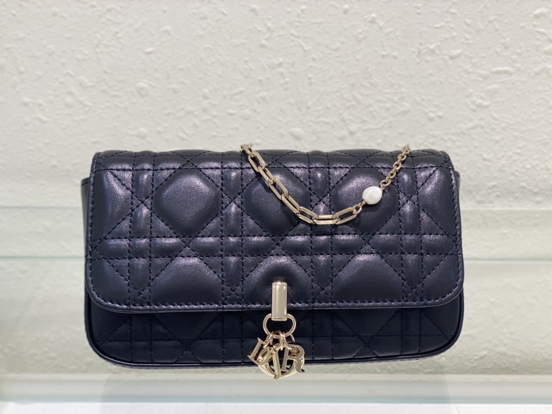 Original single quality Dior new ???? This Lady Dior clutch is exquisitely designed and spacious. Crafted from black cowhide, it is adorned with rattan checkered stitching and decorated with "D.I.O.R." pendants, highlighting the charm of classic fashion. The multi-compartment design is more practical and can store various daily necessities. The chain is decorated with beads and is convenient for carrying over the shoulder or crossbody. "D.I.O.R." pendant on the front Flip cover opening and closing design One inner septum One zipper pocket One sticker bag Six card slots The chain is decorated with beaded ornaments Made in Italy 19cm