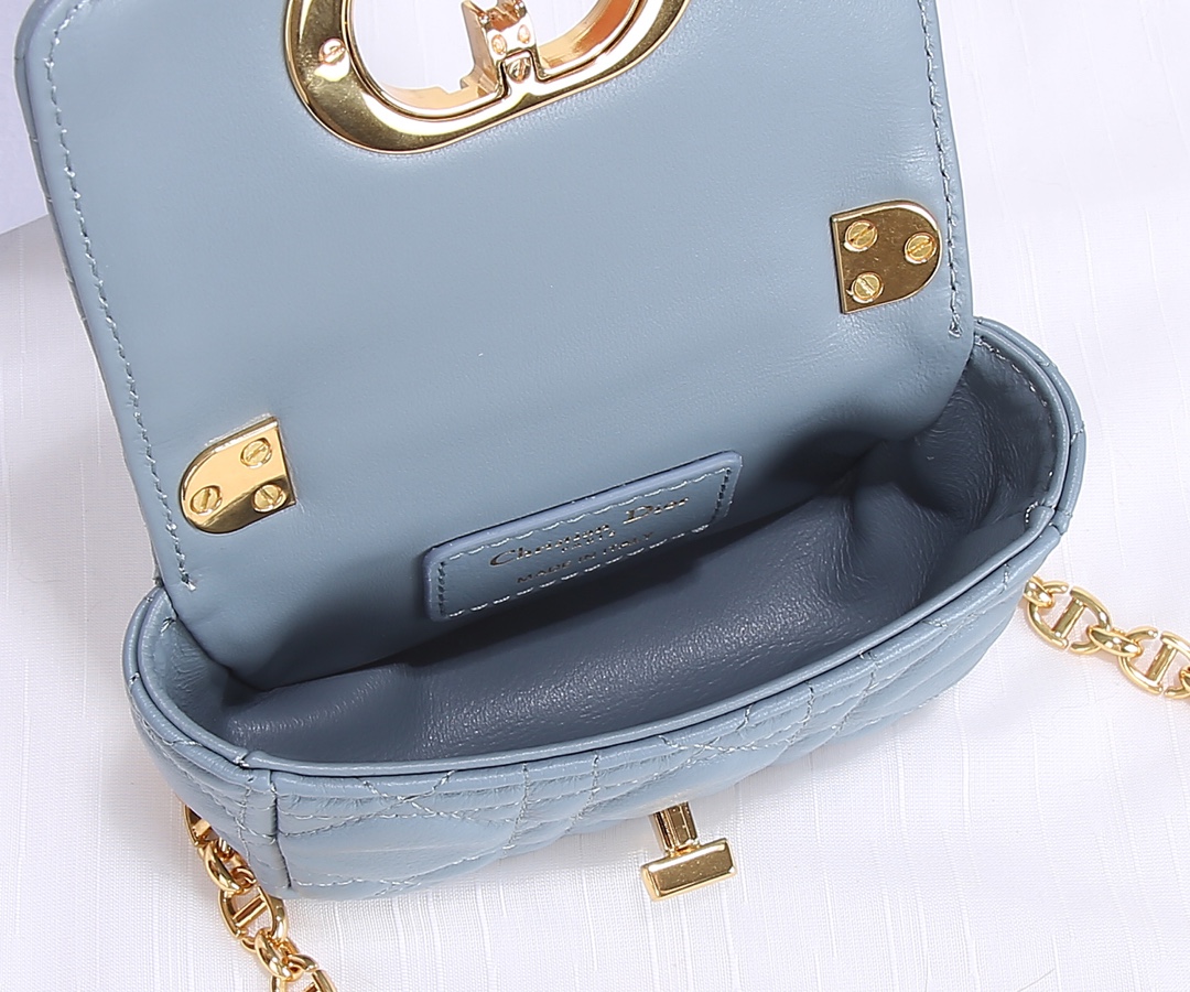 Dior's super cute mini size The Dior Caro handbag is elaborately crafted from sky blue cowhide and decorated with the signature rattan checkered stitches. The material is soft. The flip cover is decorated with a retro gold finish metal "CD" clasp, inspired by the seal of Christian Dior perfume bottles. The small-sized style comes with a detachable signature "CD" chain shoulder strap, which can also be replaced with an embroidered wide shoulder strap for a more elegant and fashionable look. Whether it's a daily look or a dinner party Dimensions: 14x8x4CM