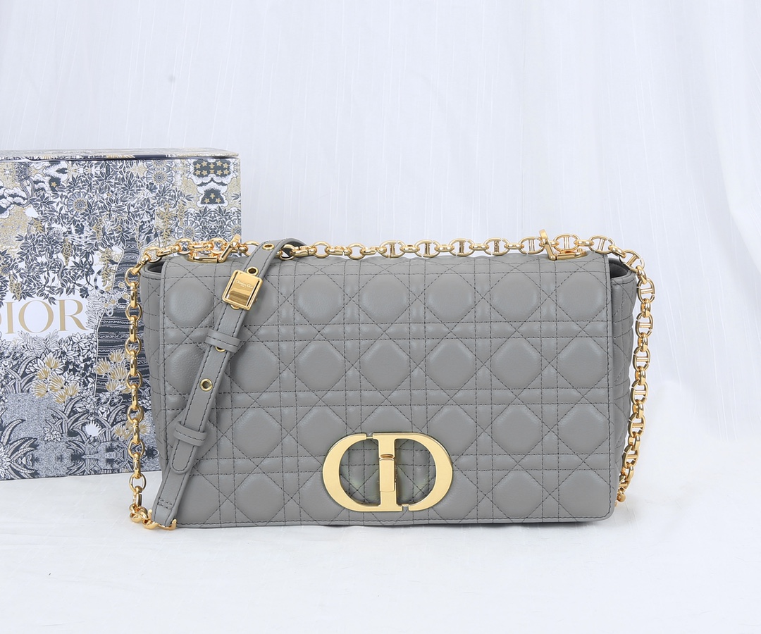 Dior has imported sheepskin inside The Dior Caro handbag is elaborately crafted from grey cowhide and decorated with the signature rattan checkered stitches. The material is soft. The flip cover is decorated with a retro gold finish metal "CD" clasp, inspired by the seal of Christian Dior perfume bottles. The small-sized style comes with a detachable signature "CD" chain shoulder strap, which can also be replaced with an embroidered wide shoulder strap for a more elegant and fashionable look. Whether it's a daily look or a dinner party Dimensions: 28x17x9CM