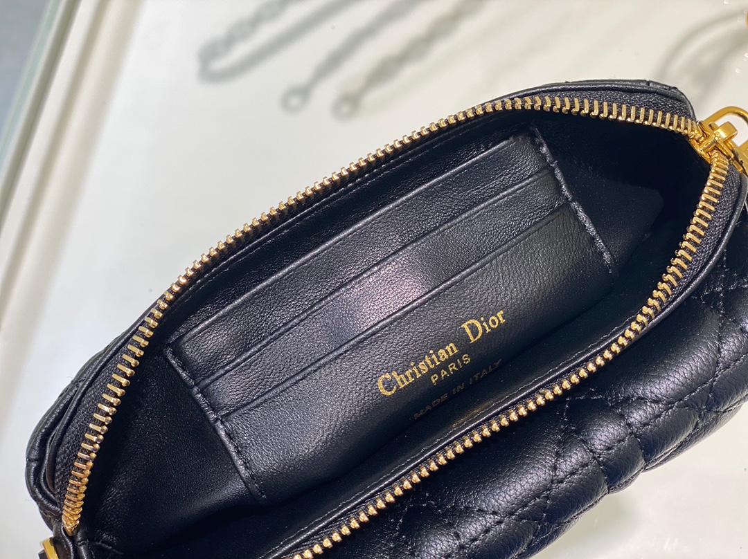 This Dior Caro chain clutch bag made of top-quality imported original cowhide from Dior is a practical and elegant item. Crafted from black soft cowhide, it is decorated with rattan checkered stitching, featuring a "CD" logo flip cover and multiple compartments, allowing for the storage of various daily necessities. It is equipped with a detachable chain shoulder strap and can be carried over the shoulder. It comes with a detachable and adjustable leather shoulder strap and can be carried diagonally. It is an ideal companion for daily wear. Dimensions: 17.5 x 10.5 x 5 cm The front is decorated with the "CD" logo Zipper opening and closing Front flip cover compartment The zipper compartment is equipped with 3 card slots One rear side sticker bag Detachable chain shoulder strap Detachable and adjustable leather shoulder straps Made in Italy
