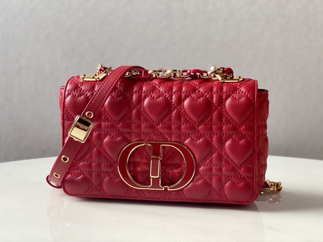Dior imported sheepskin original cowhide Caro DIOR AMour limited Edition collection ?? Crafted from cowhide with meticulous care, it features heart-shaped pattern rattan checkered stitching, combining elegance with modern style. The flip cover is decorated with an enamel rotary "CD" clasp, and is paired with a detachable "CD" logo chain shoulder strap as the finishing touch. It can be carried by hand, over the shoulder or crossbody, and can also be replaced with an embroidered wide shoulder strap for a bright and eye-catching appearance. It can be matched with daily looks or evening wear. Model Number 2023 (The image is a small size) Large size: 28x17x9cm Medium size: 25.5x15.5x8cm Small size: 20x12x7cm