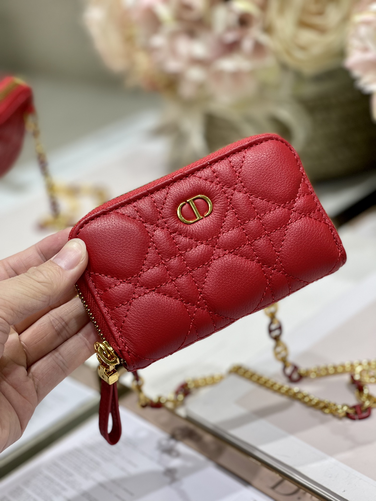 Dior Mini DIOR CARO zipper clutch The inner and outer full leather rattan checkered pattern This Dior Caro zipper clutch is an exquisite and practical accessory. Crafted from both inner and outer full leather, it is decorated with the signature rattan checkered stitching. It is equipped with a detachable chain and decorated with enamel links to enhance the style. It can be carried over the shoulder, slung diagonally or put in a pocket. It can store bank cards, coins, AirPods and keys Size: 12 x 8.5 centimeters 5087 #