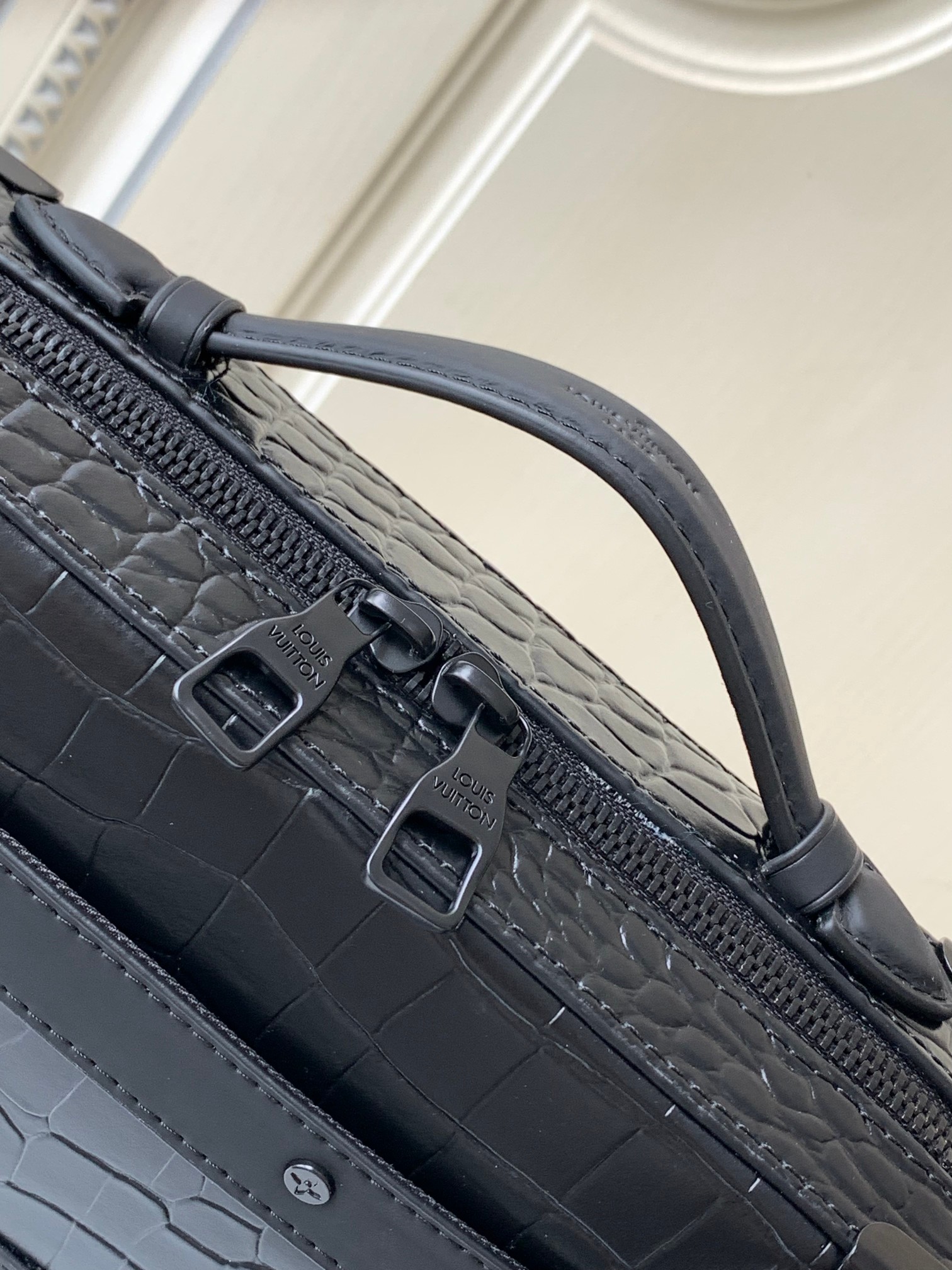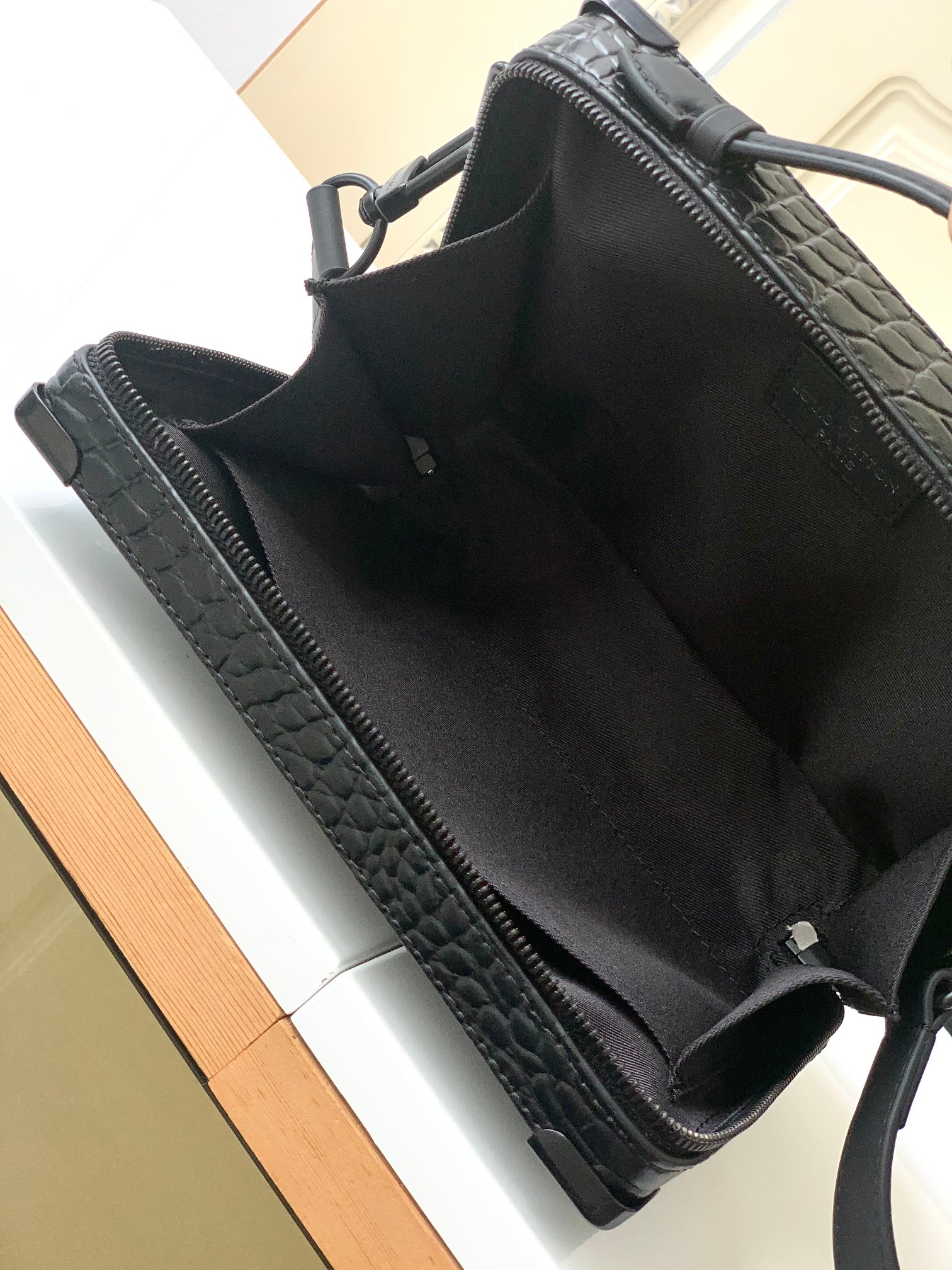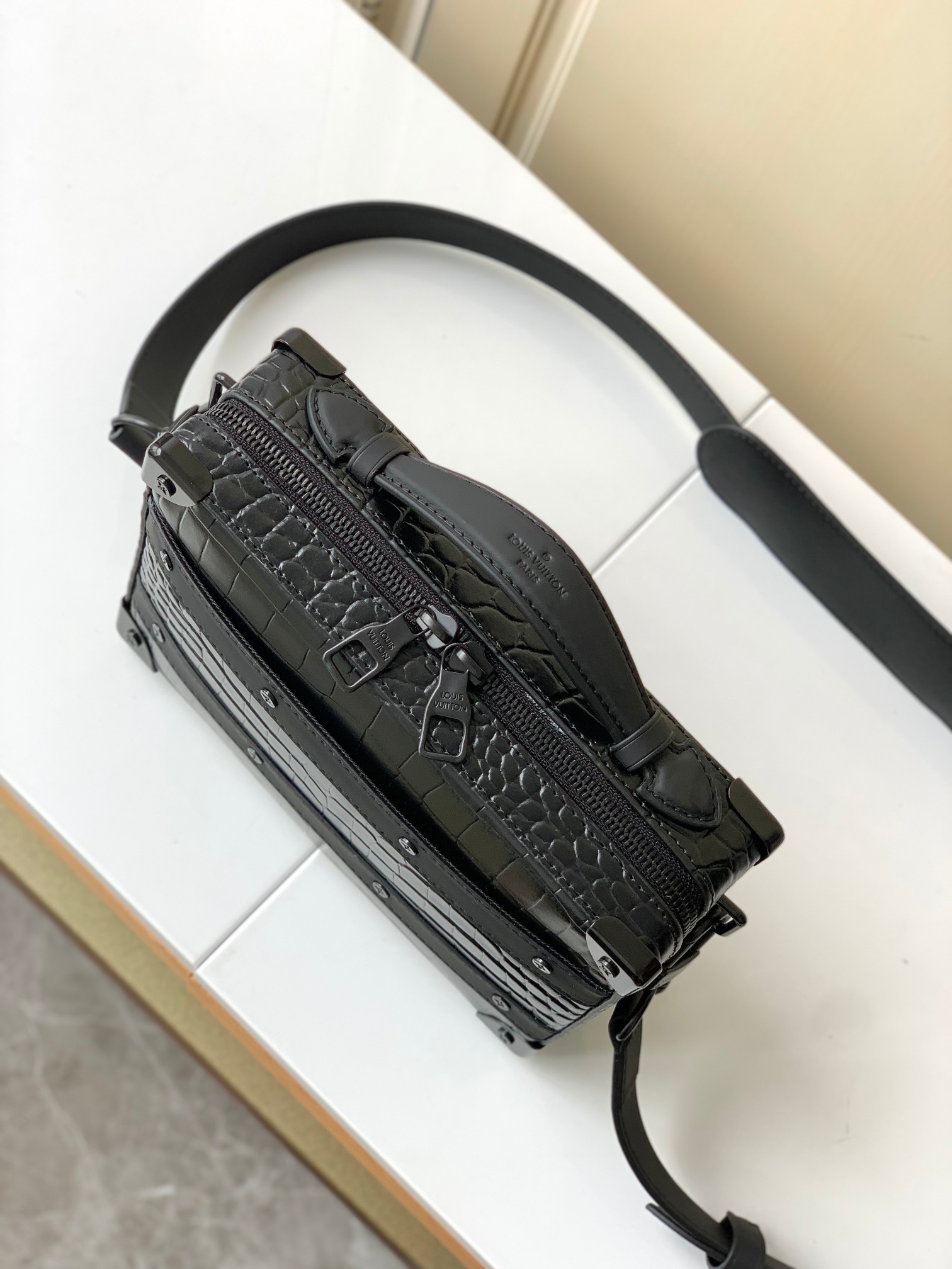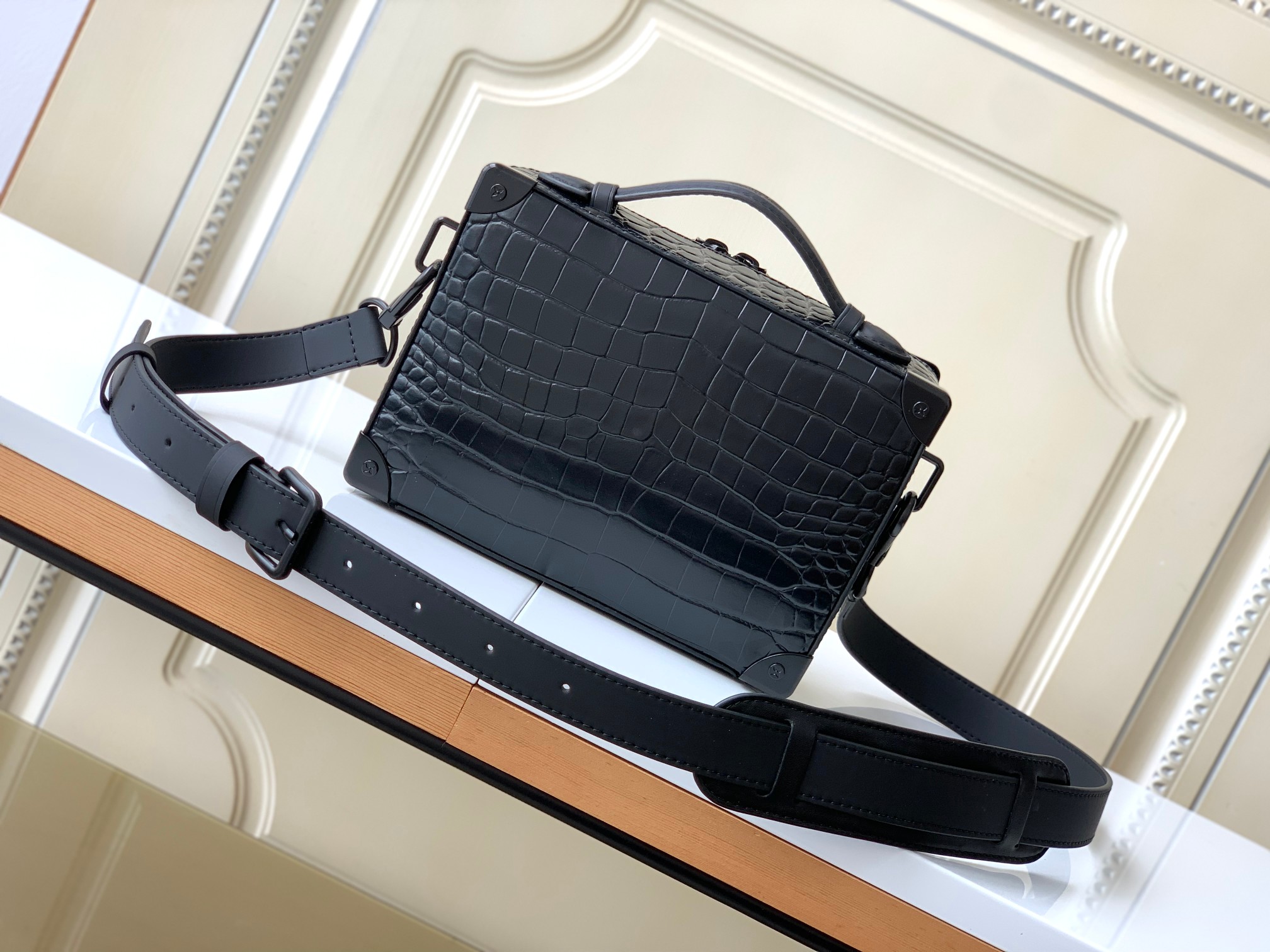 Top-quality original copy M59351 black crocodile pattern. This Handle Soft Trunk handbag is made of Monogram leather with fine embossed texture, continuing Louis Vuitton's box-making tradition with rivet corners and leather reinforcing straps. The wide opening and closing make it convenient to take out and put in items, and it is suitable for storing small electronic devices and portable needs. The neat design and detachable shoulder straps make it easy to carry. Detailed features: 21.5 x 15 x 7 centimeters (Length x height x width)