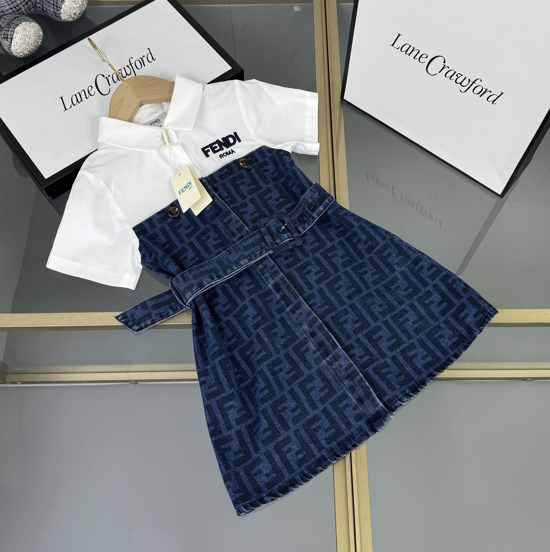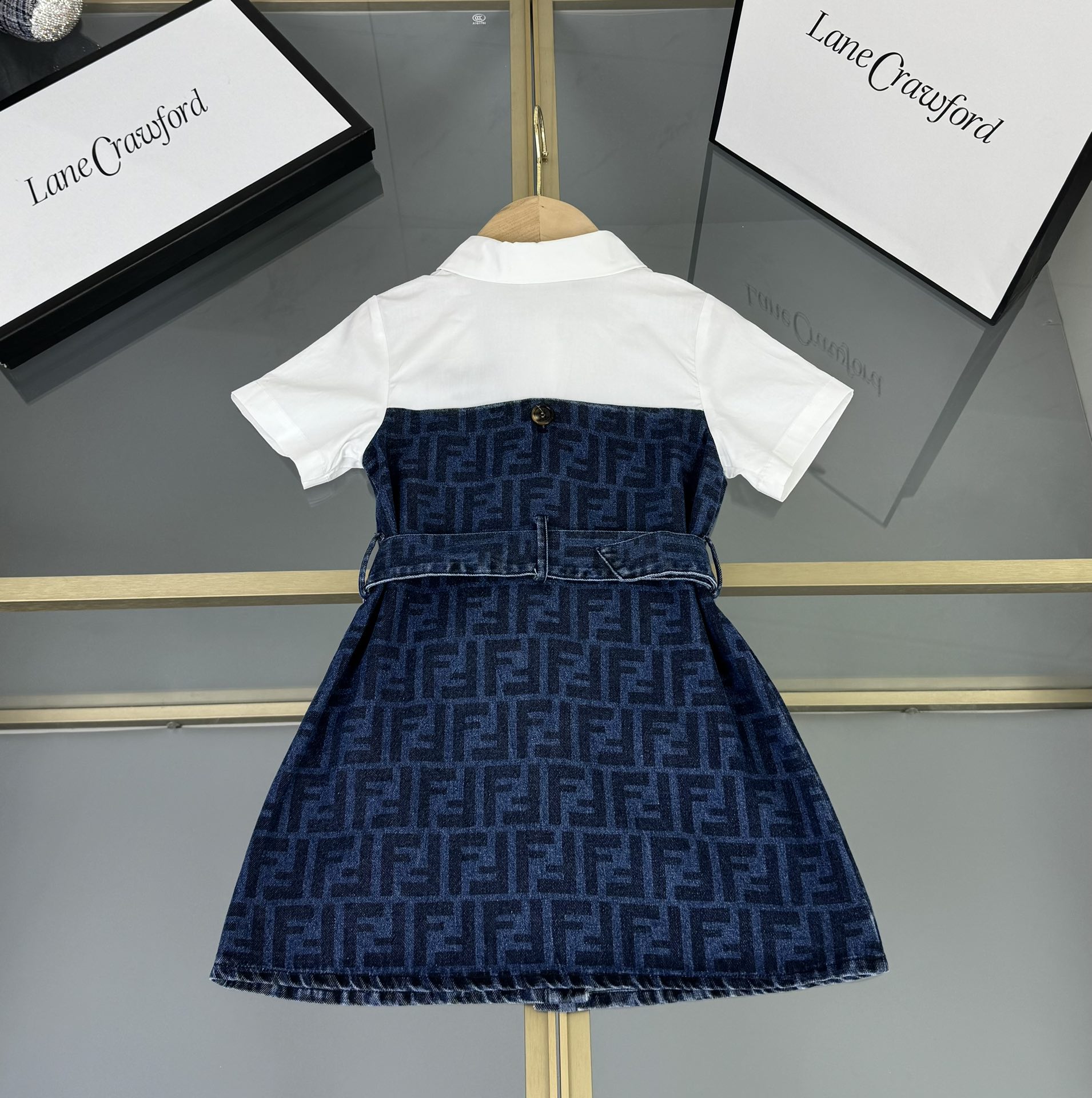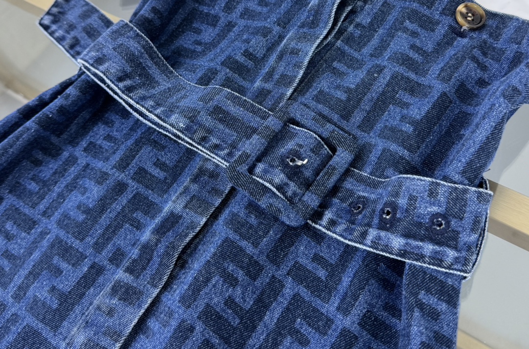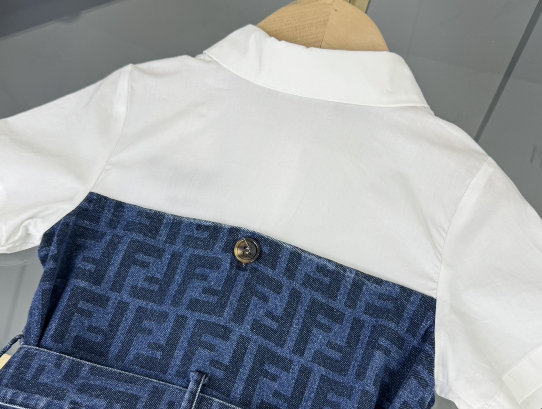 Fendi, high-end children's clothes, girls dress, small jacquard collar splicing dress, custom stitching FF full printed denim fabrics, upper body comfortable, good-looking, code number: 100/110/120/130/140/150 cm