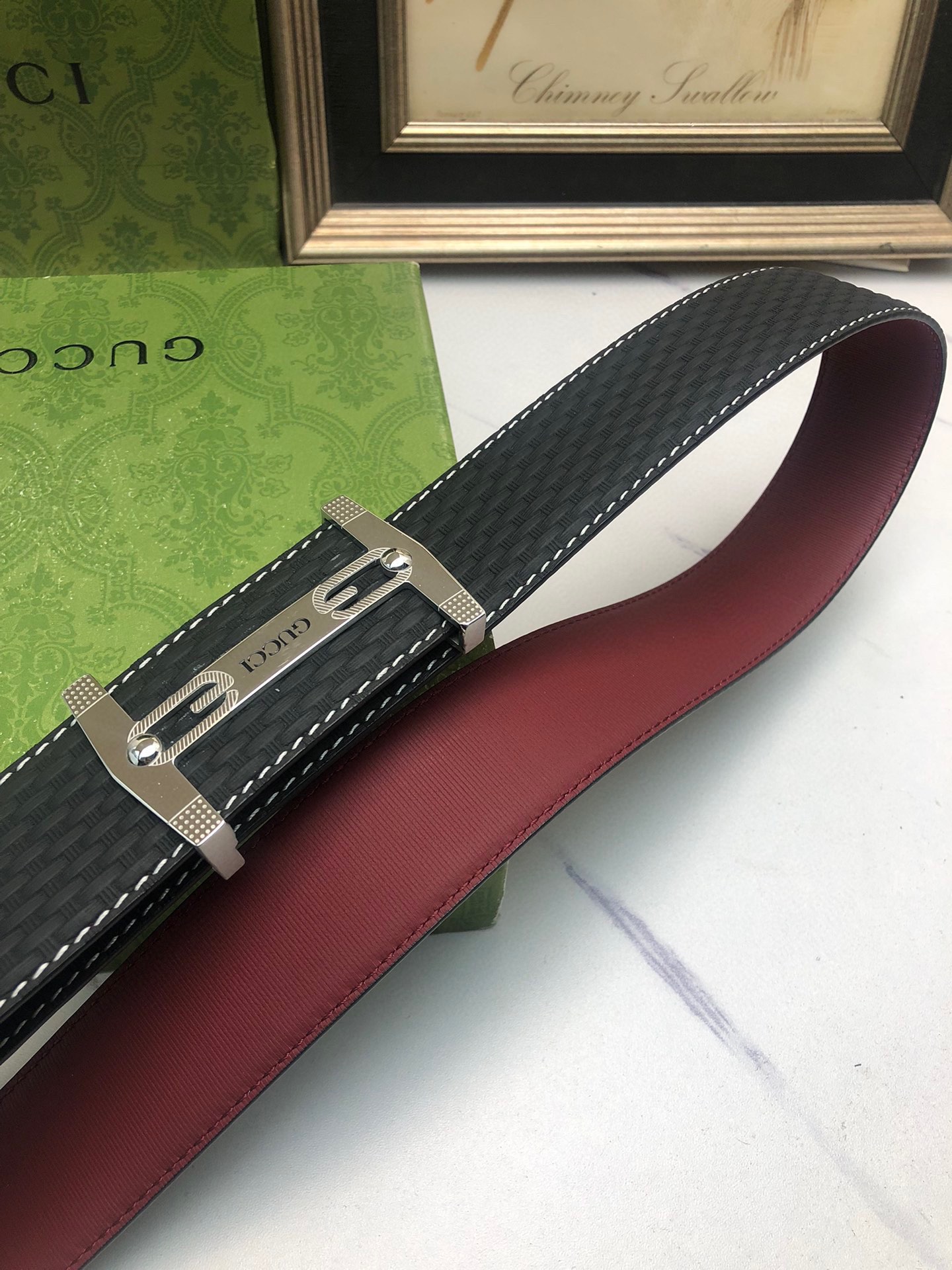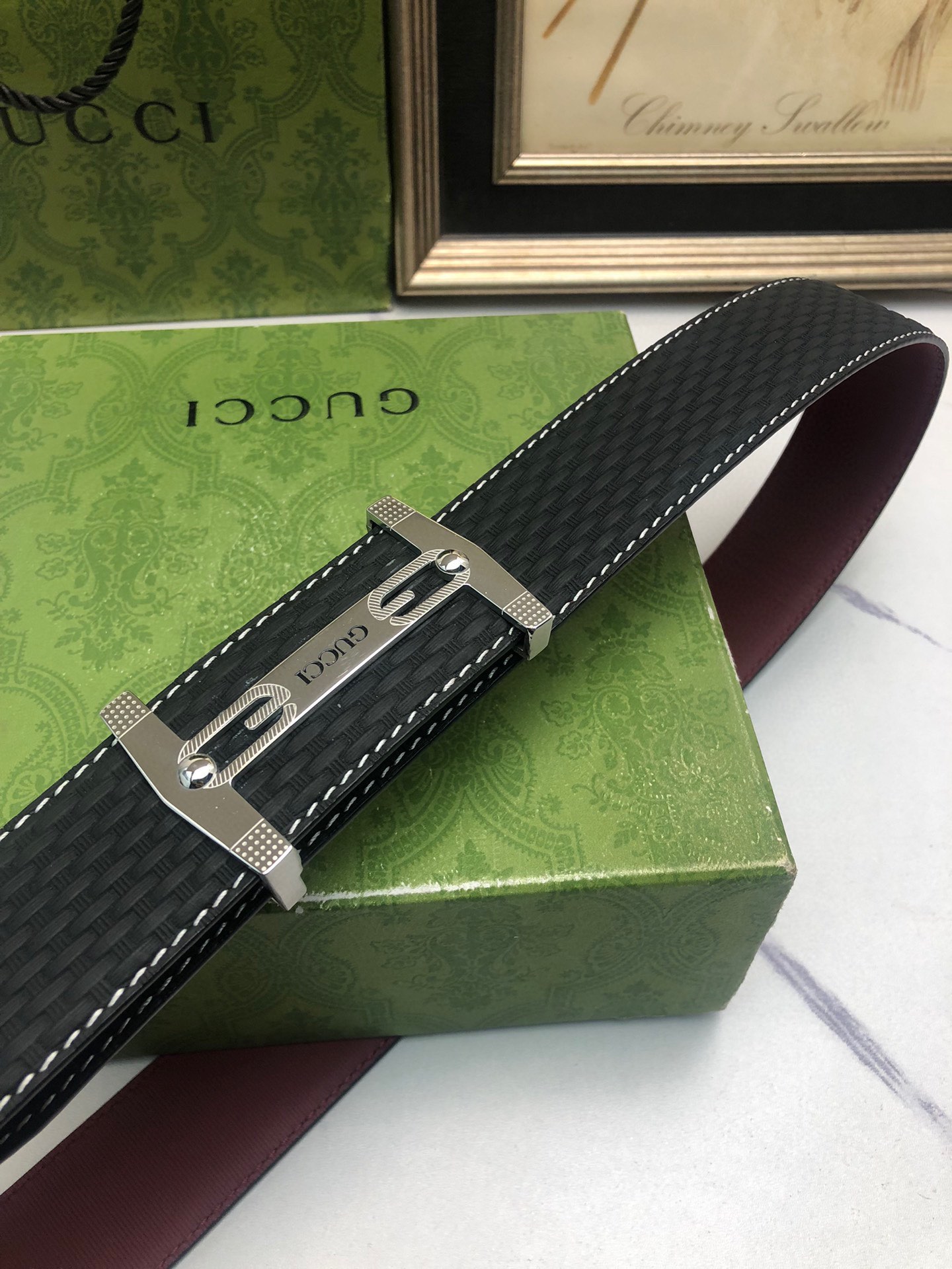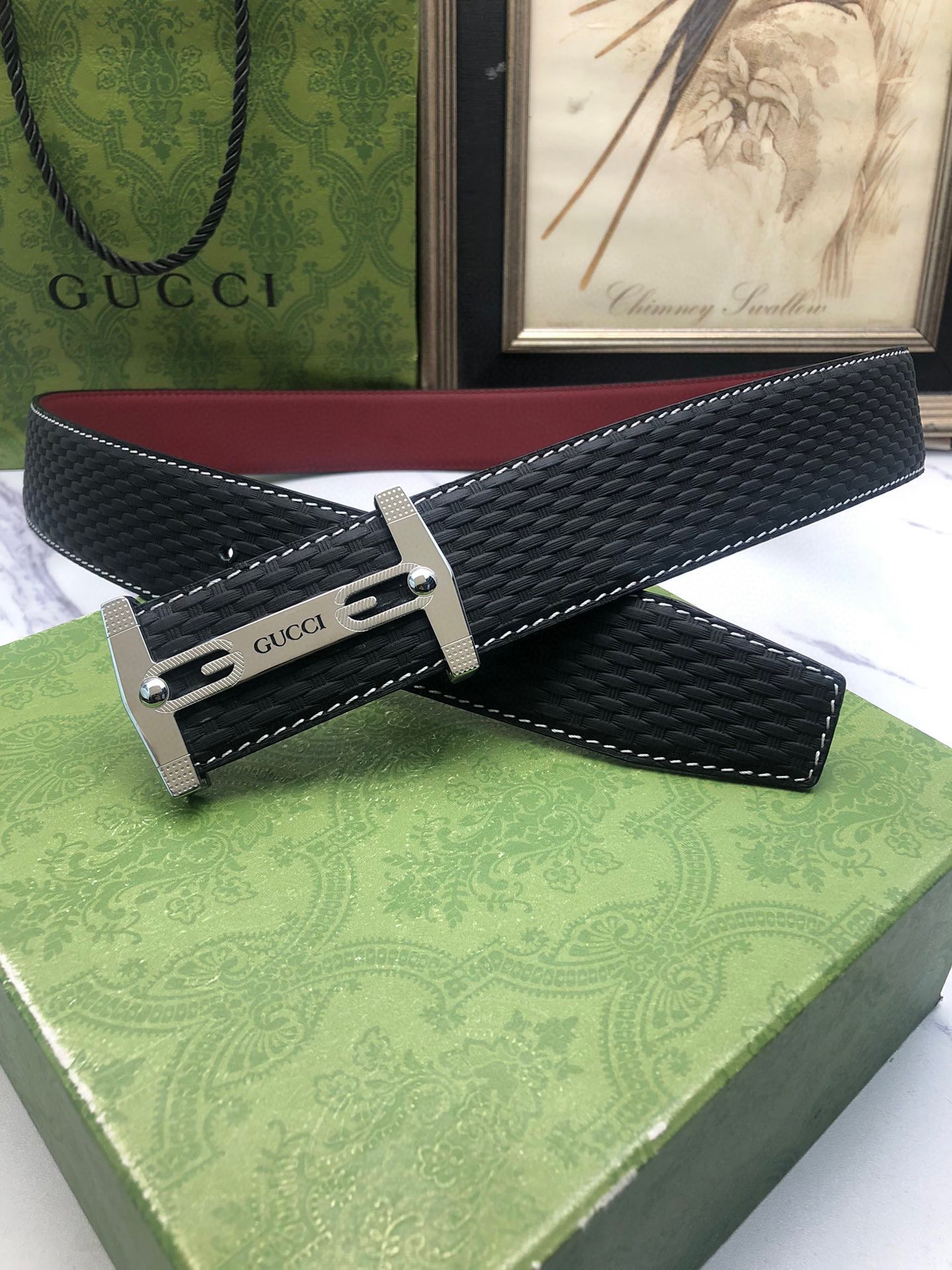 Gucci: Original single-grain calfskin with embossed patterns, lined with plain cowhide base, creating a woven appearance. Decorated with the original single buckle of the logo. The counter width is 4.0