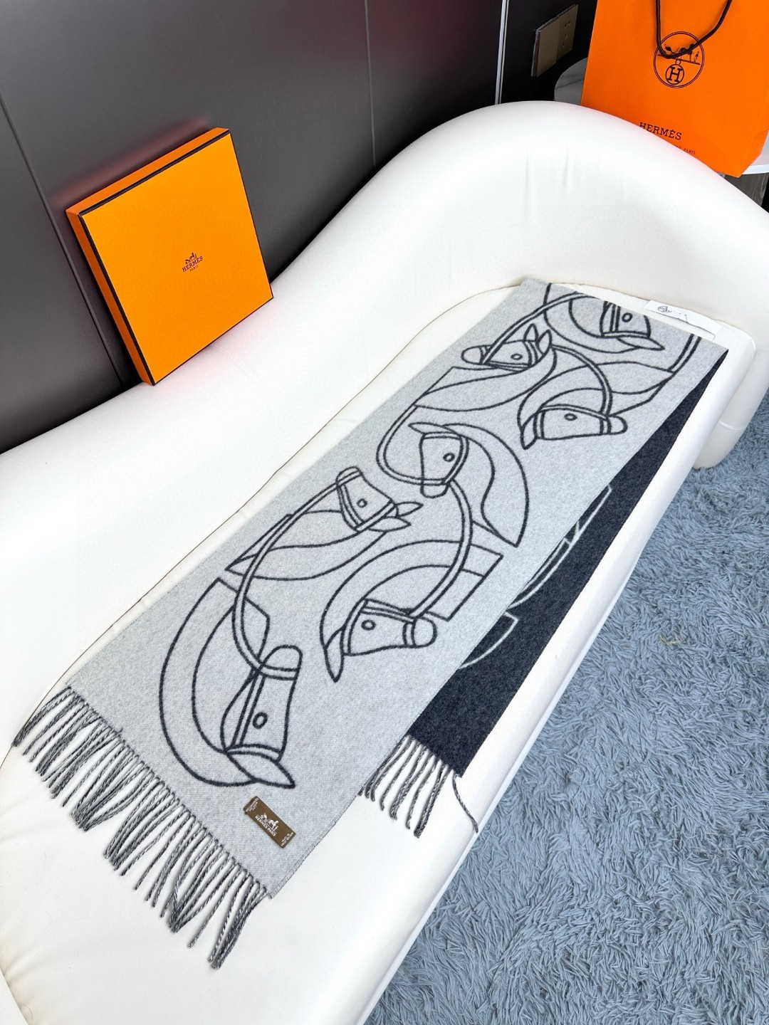 This new Hermes scarf features a delicate color-blocking jacquard weaving, presenting the Entrelacs Equestres horse head pattern designed by Geoff McFetridge. The size is 40*195CM