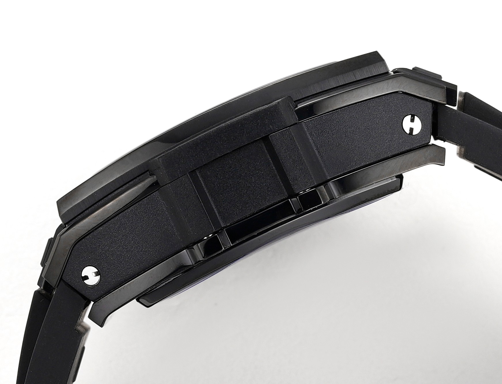 HUBLOT The Soul BIG BANG series. Model 642.NX.0170.RX Inspired by racing cars, a brand-new limited edition Spirit of Big Bang wristwatch is launched! The wristwatch combines all the iconic elements of the Spirit of Big Bang series with a brand-new barrel-shaped case. The case is made of titanium and resin materials, and a "sandwich" structure is constructed with six H-shaped screws, conveying the concept of "integrated technology". It perfectly replicates the exclusive custom HUB4700 movement, with an original folding clasp and a custom fluororubber strap. The watch is equipped with a "one-click" quick-change strap system. The wearer can easily and quickly change the strap with just a light press!!