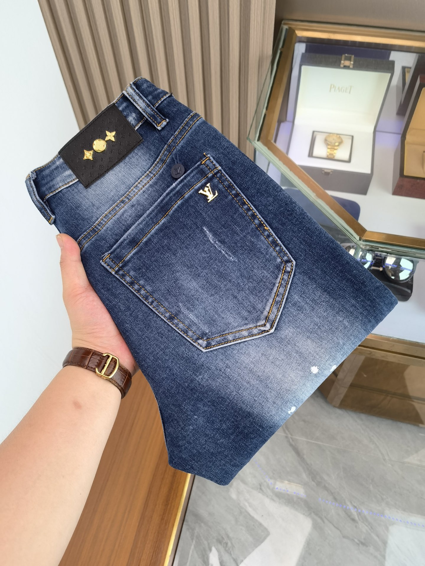 LV men's denim jeans, officially announced album poster outfit style! This high-end imported denim fabric is specially selected from the pure 13oz ounce denim fabric of Okayama, Japan. It features an eco-friendly plant enzyme washing process. The texture has a light retro color, which is very beautiful and perfectly suits the color matching of autumn and winter. After washing, the fabric is soft and fine, but has a strong sense of elasticity and a slight elasticity, providing an excellent comfortable experience. There is no damage from any craftsmanship elements throughout, preserving the purest natural color of the tannin! All the details are perfect, exquisite and meticulous. The latest waist leather label highlights the brand's characteristics. The hardware accessories, leather labels and wiring all demonstrate the craftsmanship! The cut is perfect, with an excellent effect of lifting the buttocks and shaping the body. It can easily be paired with any top in the wardrobe, has wide compatibility, and meets the needs of various daily outfits. The upper body style is very stylish. It is a must-have pants for quality control and 1V enthusiasts! Size: 28-38, no 35 or 37
