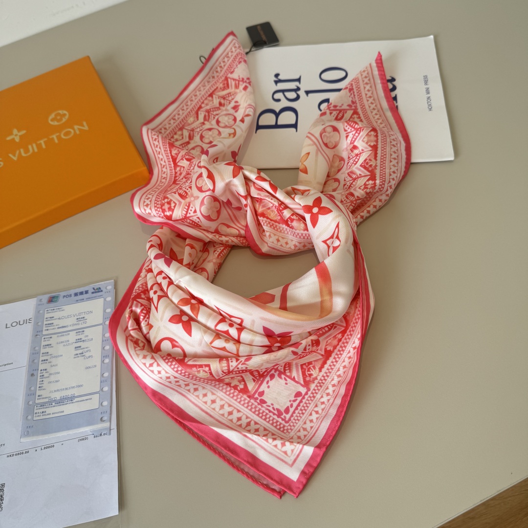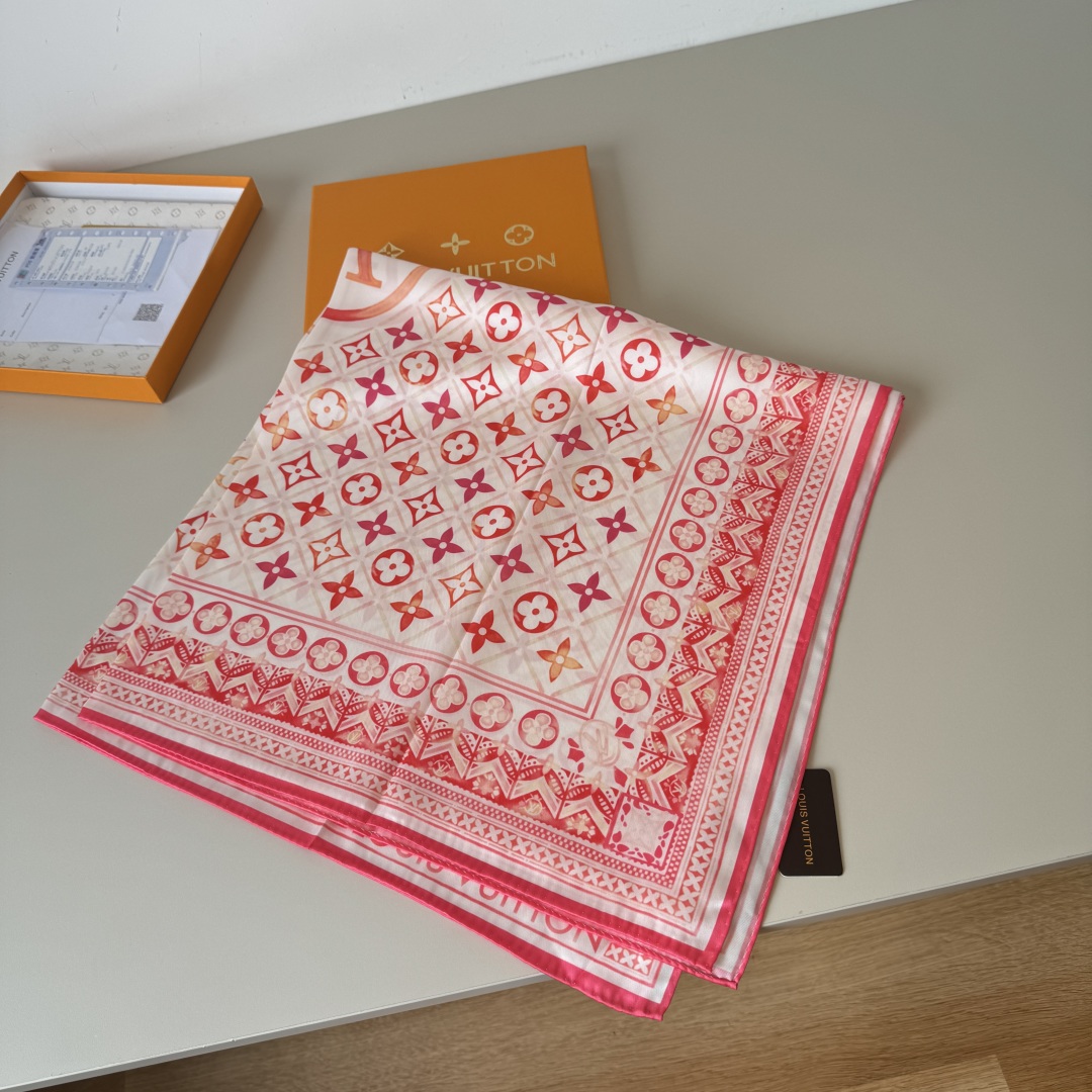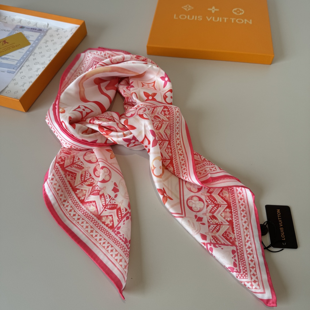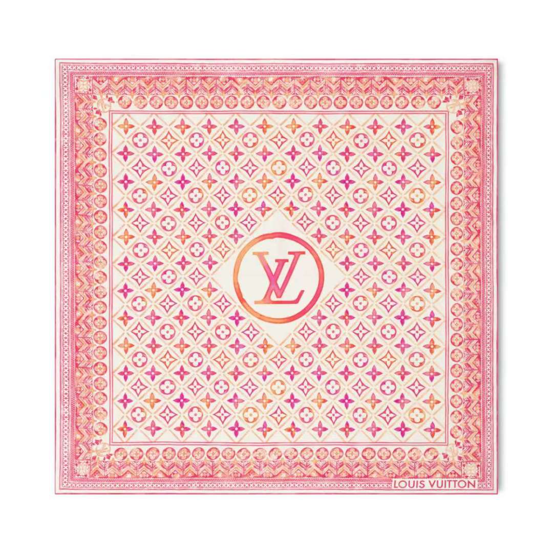 The new LV handkerchief The LV Tiles mulberry silk handkerchief Outlines the border with magnificent inlaid patterns and depicts the Monogram pattern with watercolor-like artistic brushstrokes. The LV Circle logo emerges in the center, slowly revealing the summer charm and making it a creative choice for brand fans. 90 x 90 centimeters 100% mulberry silk