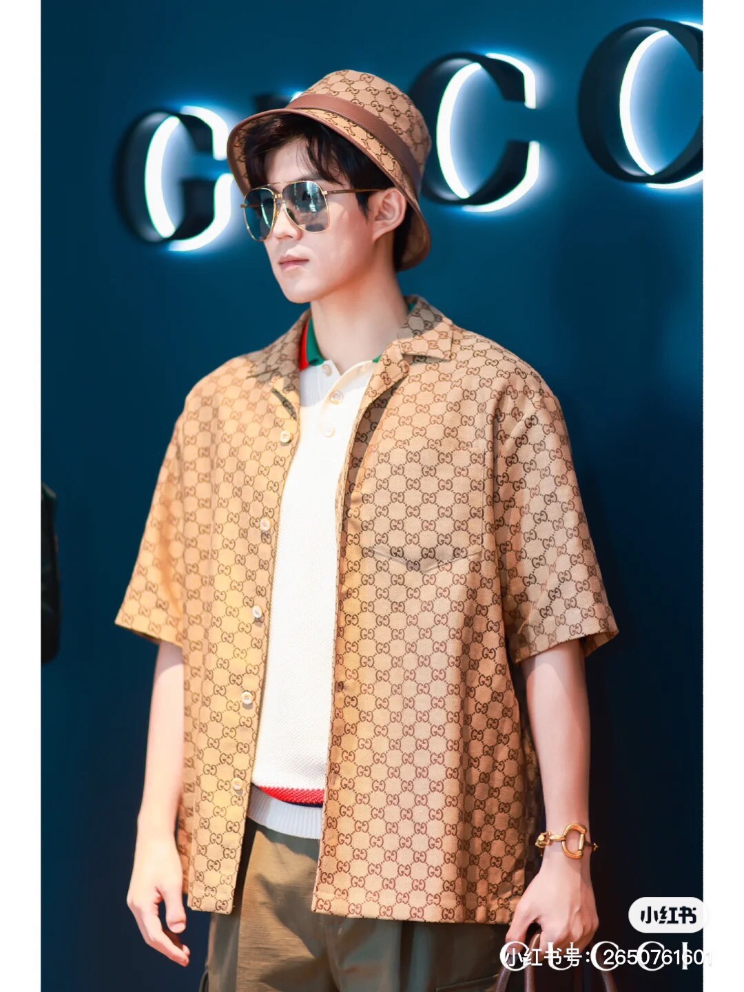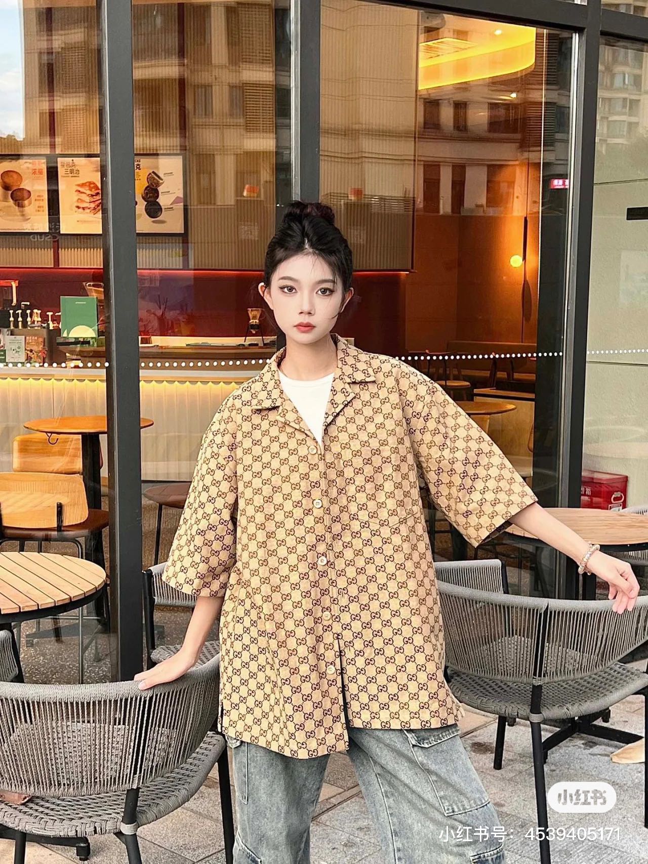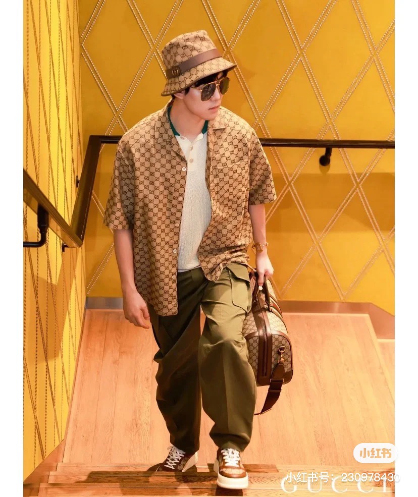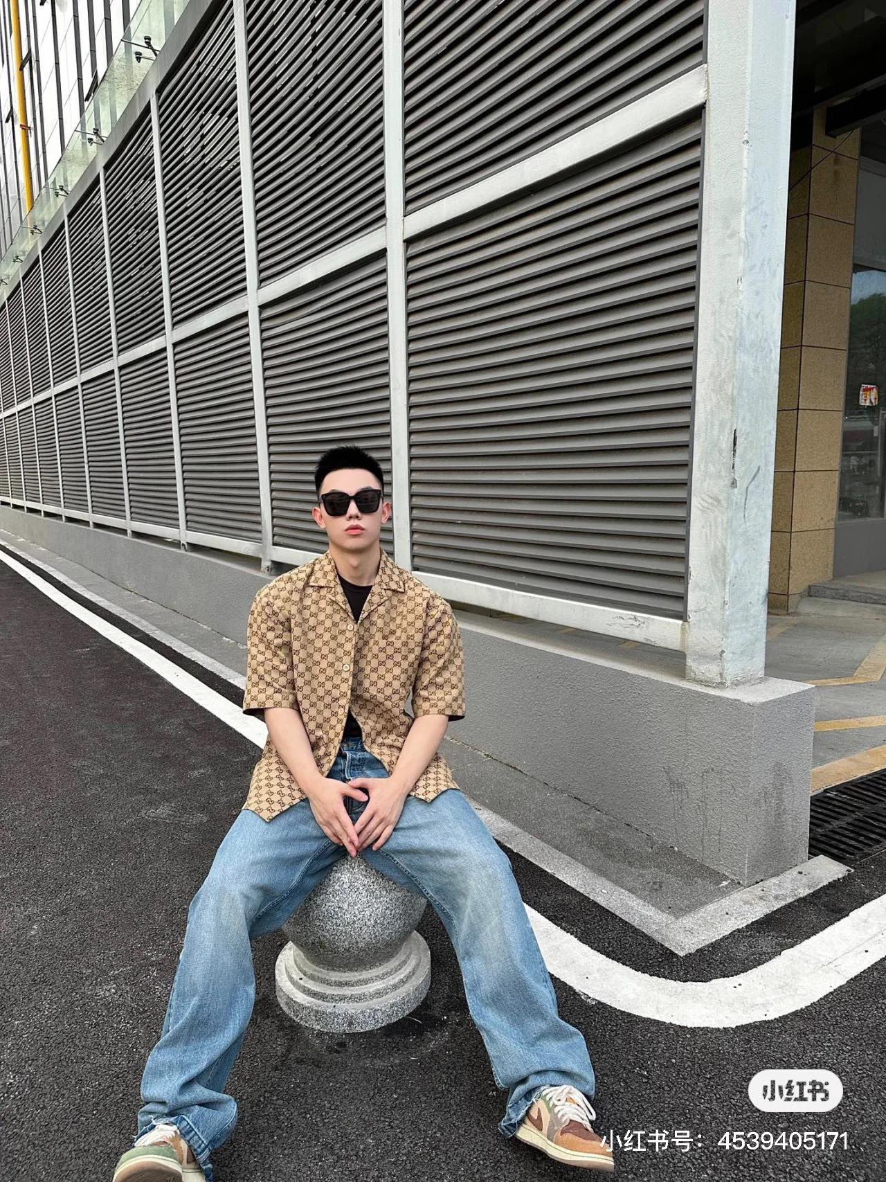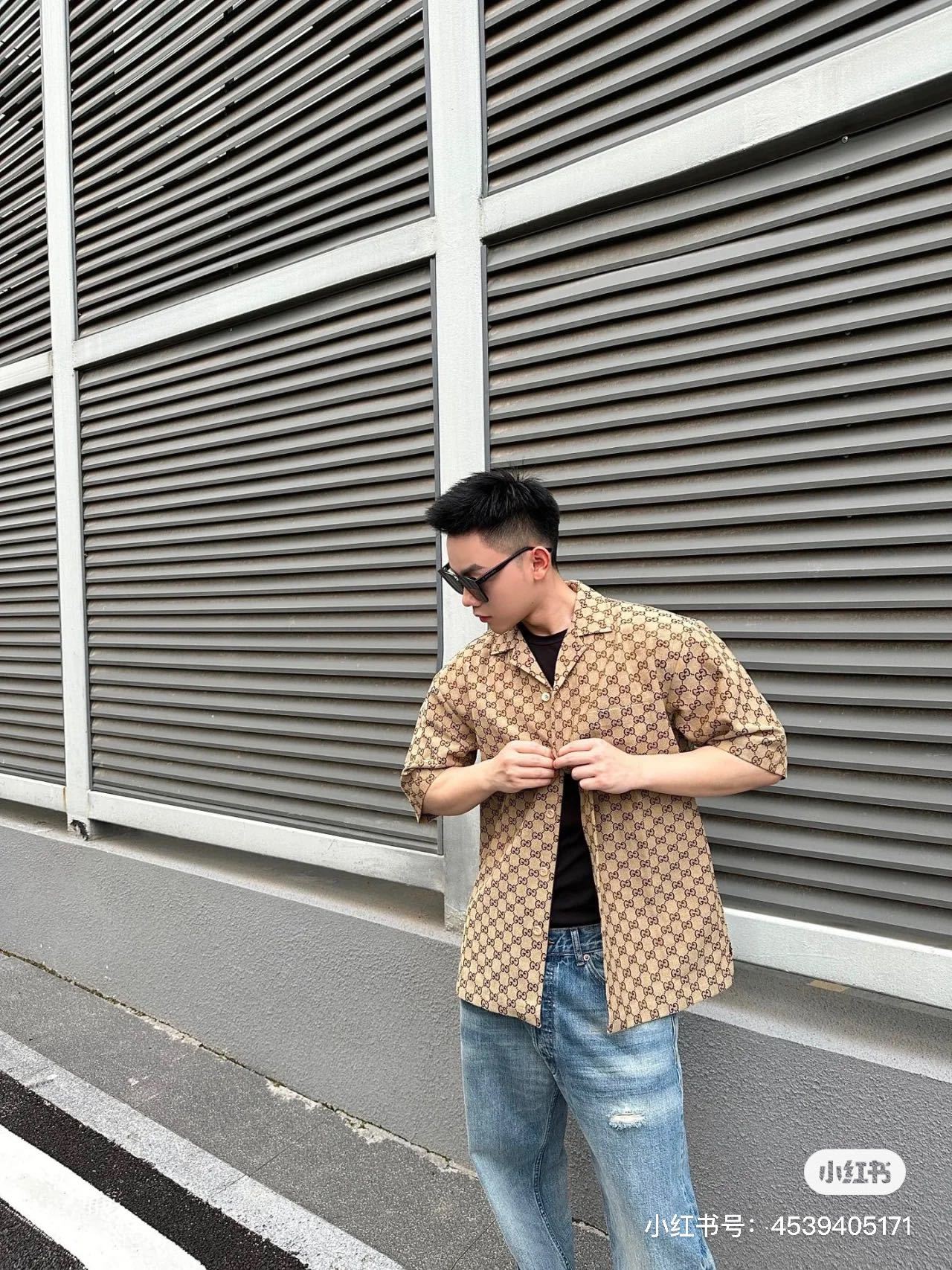 Gucci ?????????? GC 24SS double G small jacquard lapel short-sleeved shirt model wearing figure #