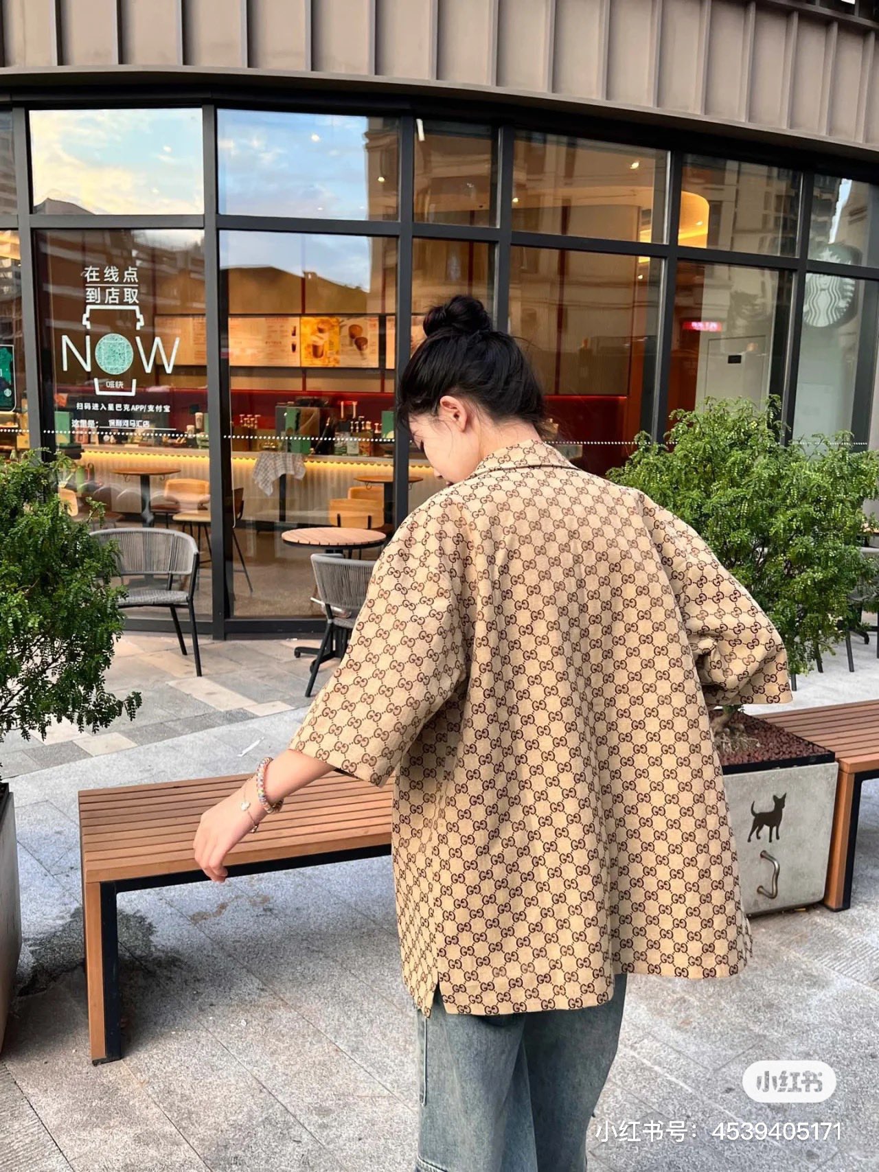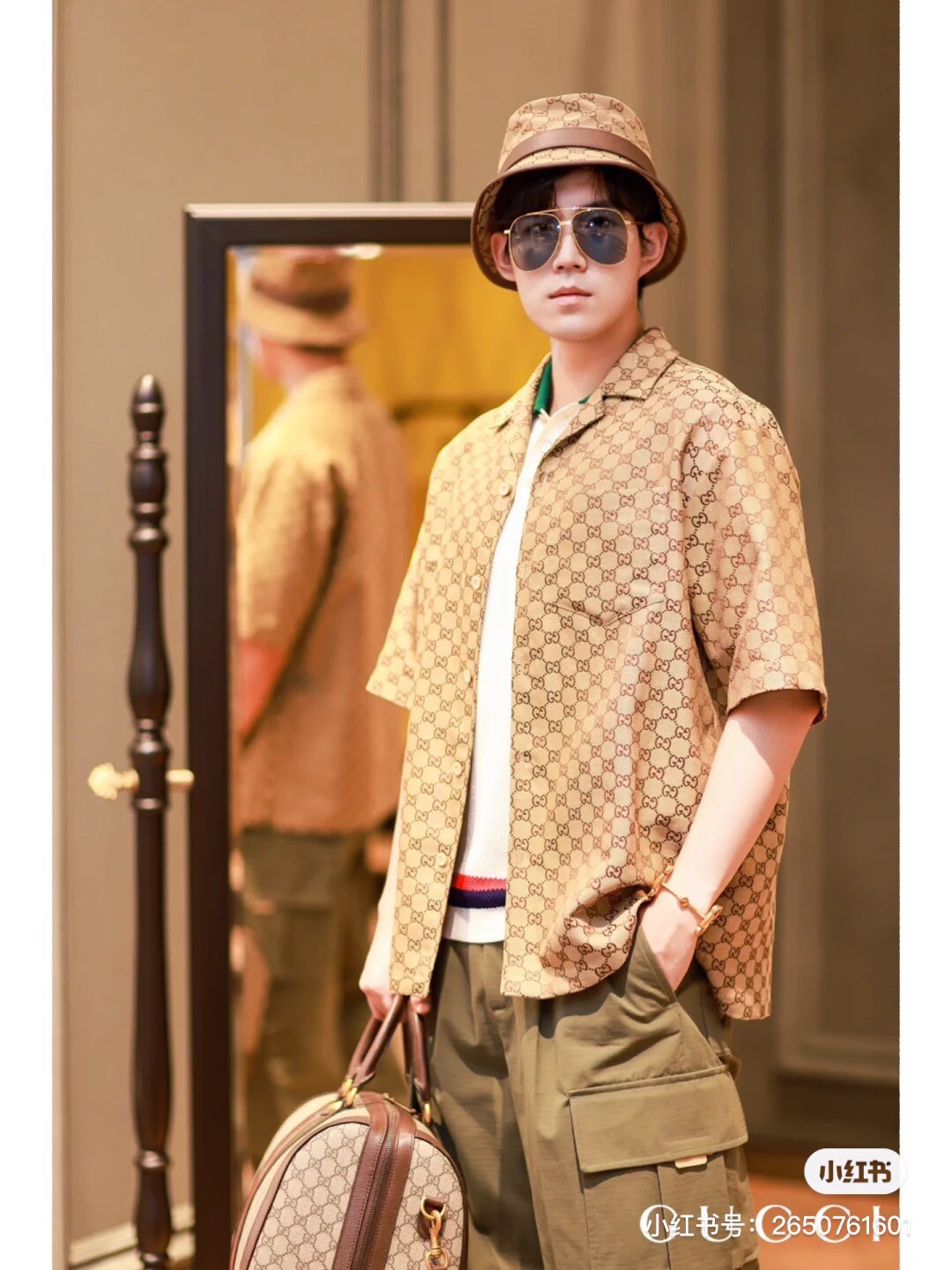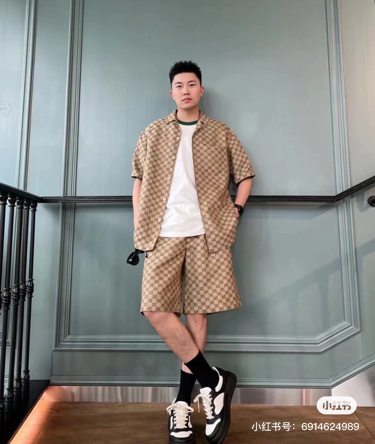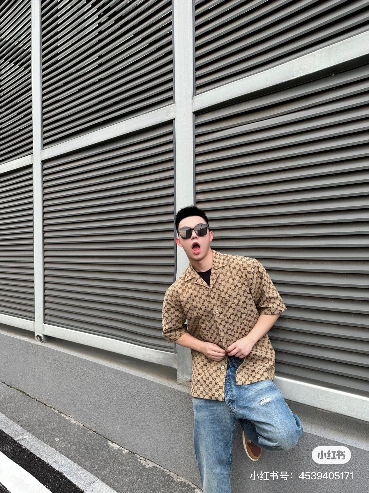 Gucci ?????????? GC 24SS double G small jacquard lapel short-sleeved shirt model wearing figure #