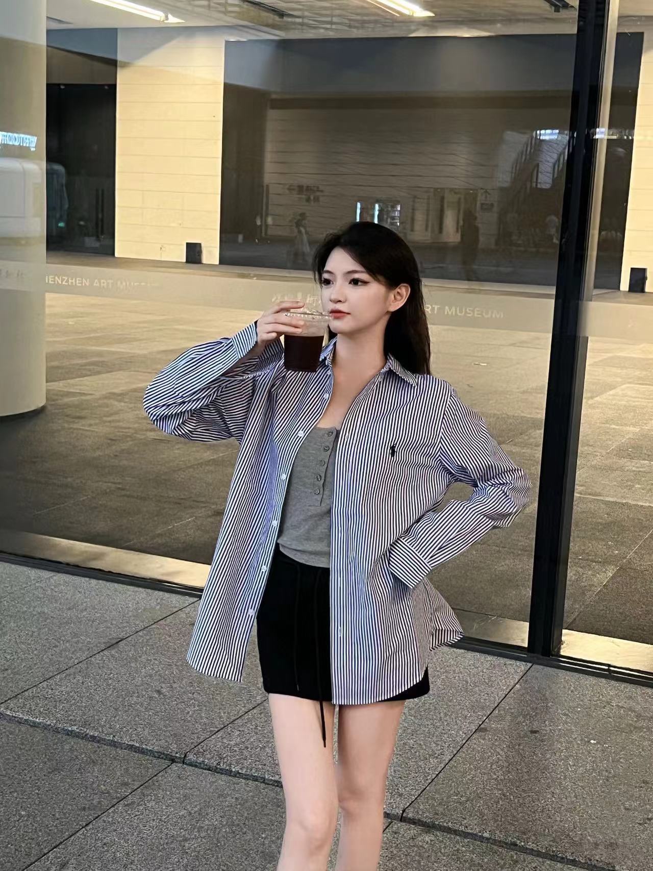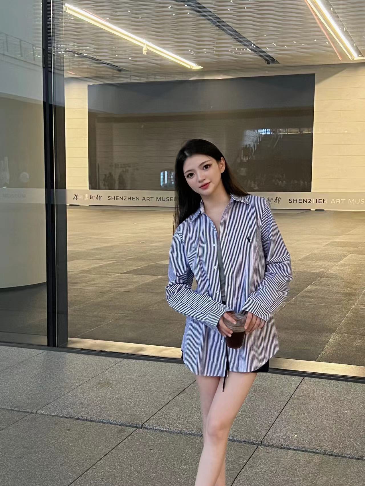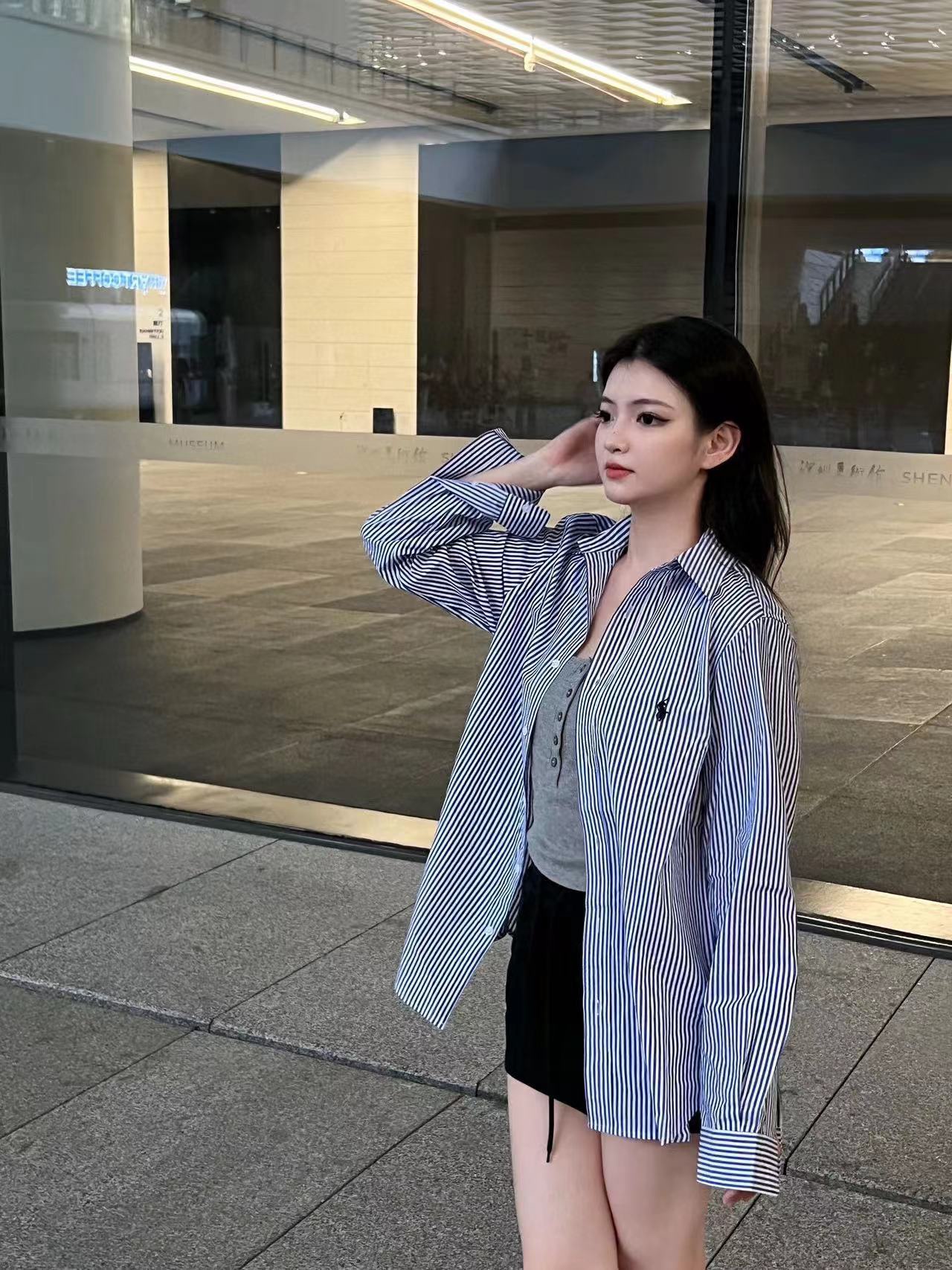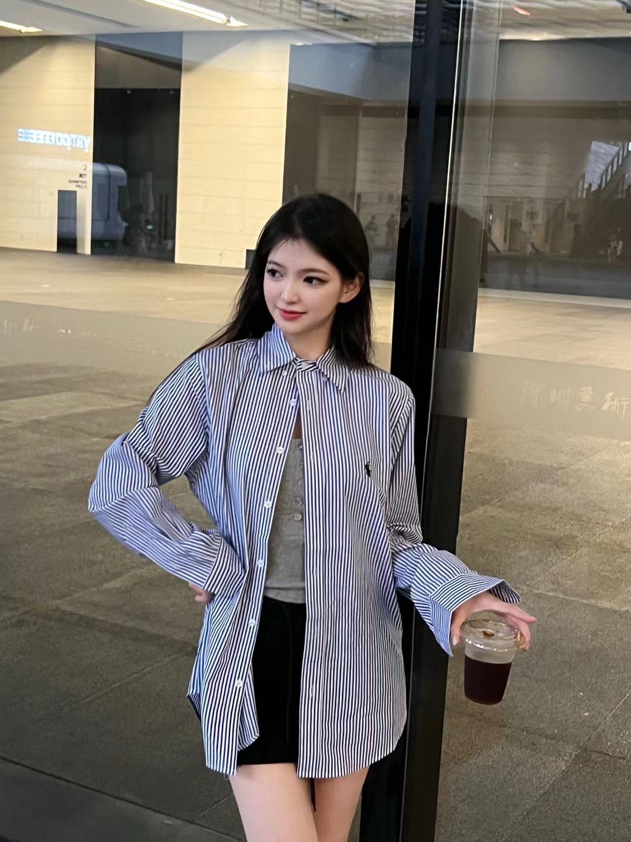 The wearing effect of Ralph Lauren/ Ralph Lauren blue and white striped small label warhorse embroidery casual shirt #