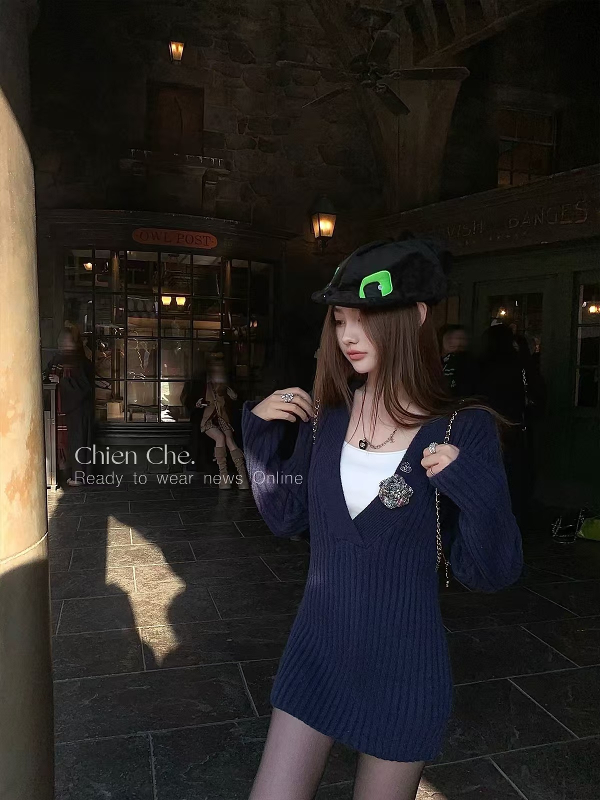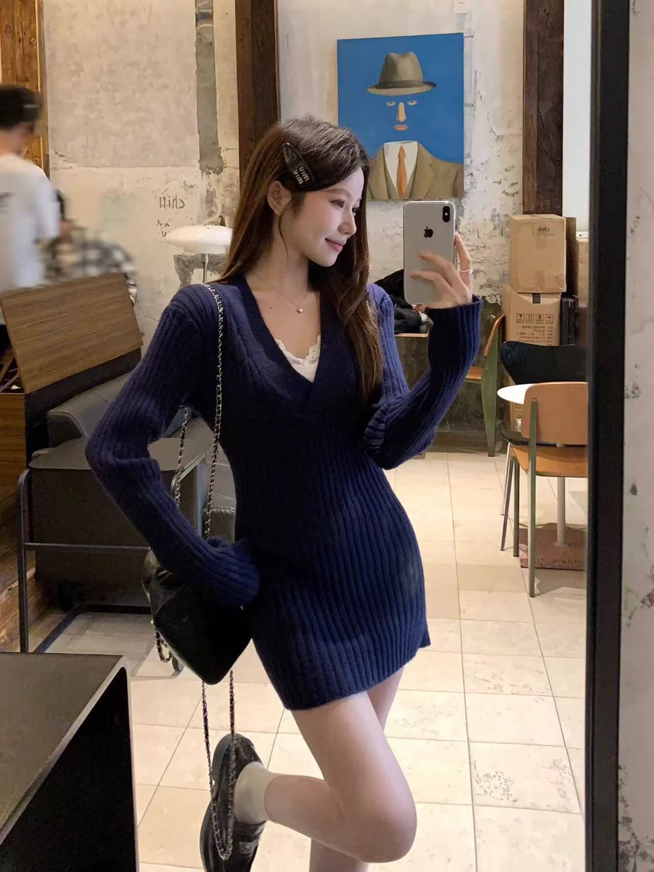 A small chanel-style floral knitted dress for women in autumn and winter, purely sensual V-neck, body-hugging skirt, with a sweater underneath. sml