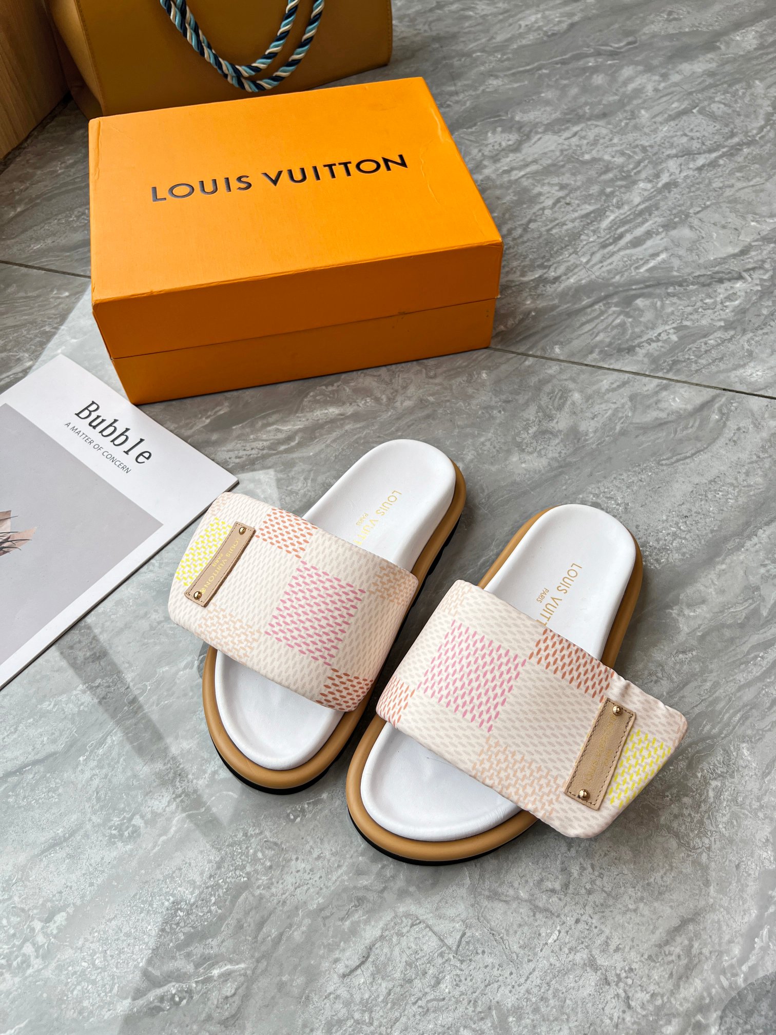 Style #2004??????. L Donkey L Family's best-selling embossed logo patterned flip-flops. This Pool Pillow Comfort flat-bottomed flip-flops is made of technological fabric and reinterprets the Monogram pattern with high-frequency embossing technology. Soft padded upper with adjustable Velcro, comfortable and resilient insole with harmonious color ?? Fabric: Original custom tech fabric ?? Lining: Soft sheepskin ?? Sole: original molded rubber foam outsole ??Size: 35-44 (45.46.47)