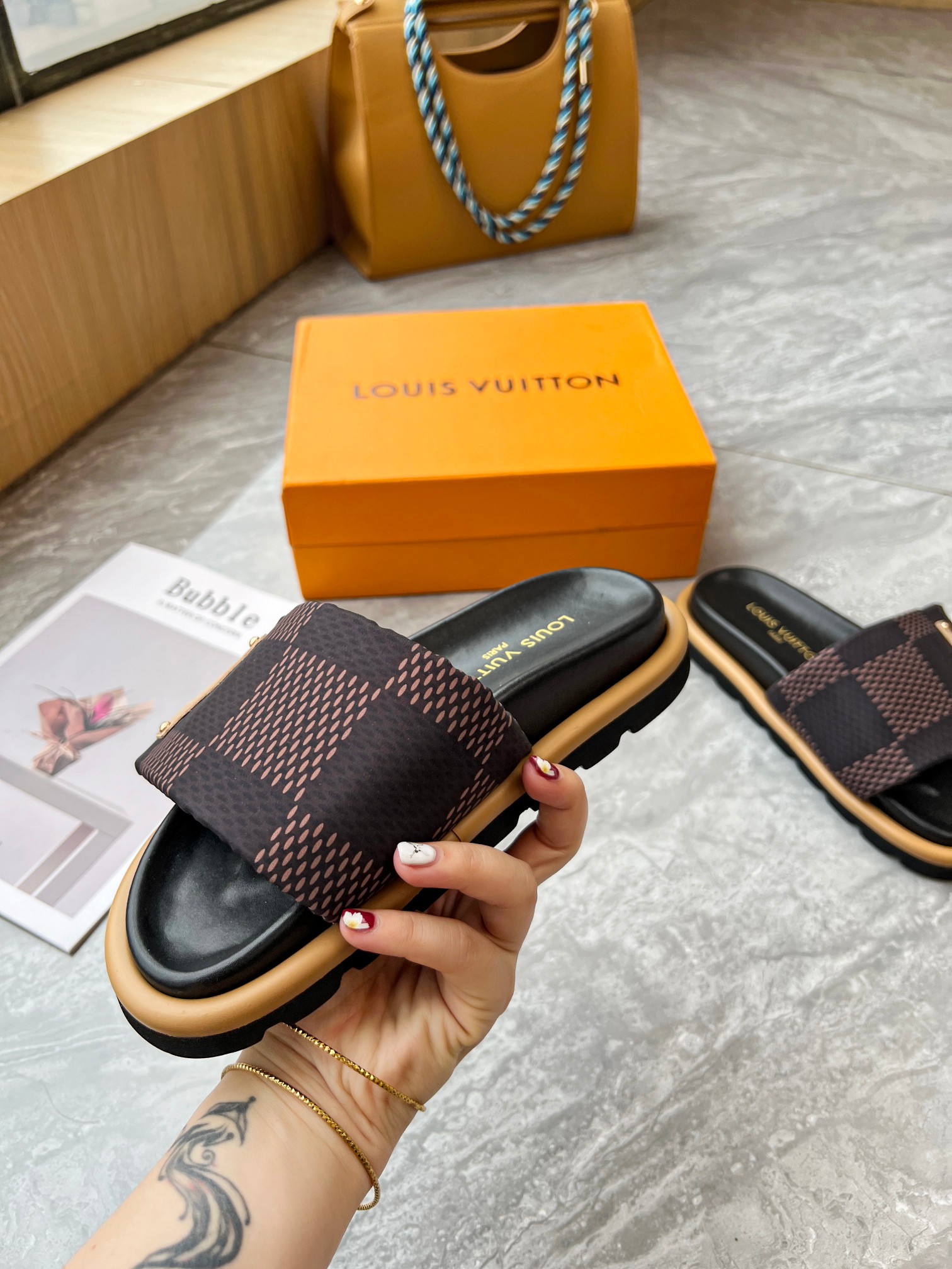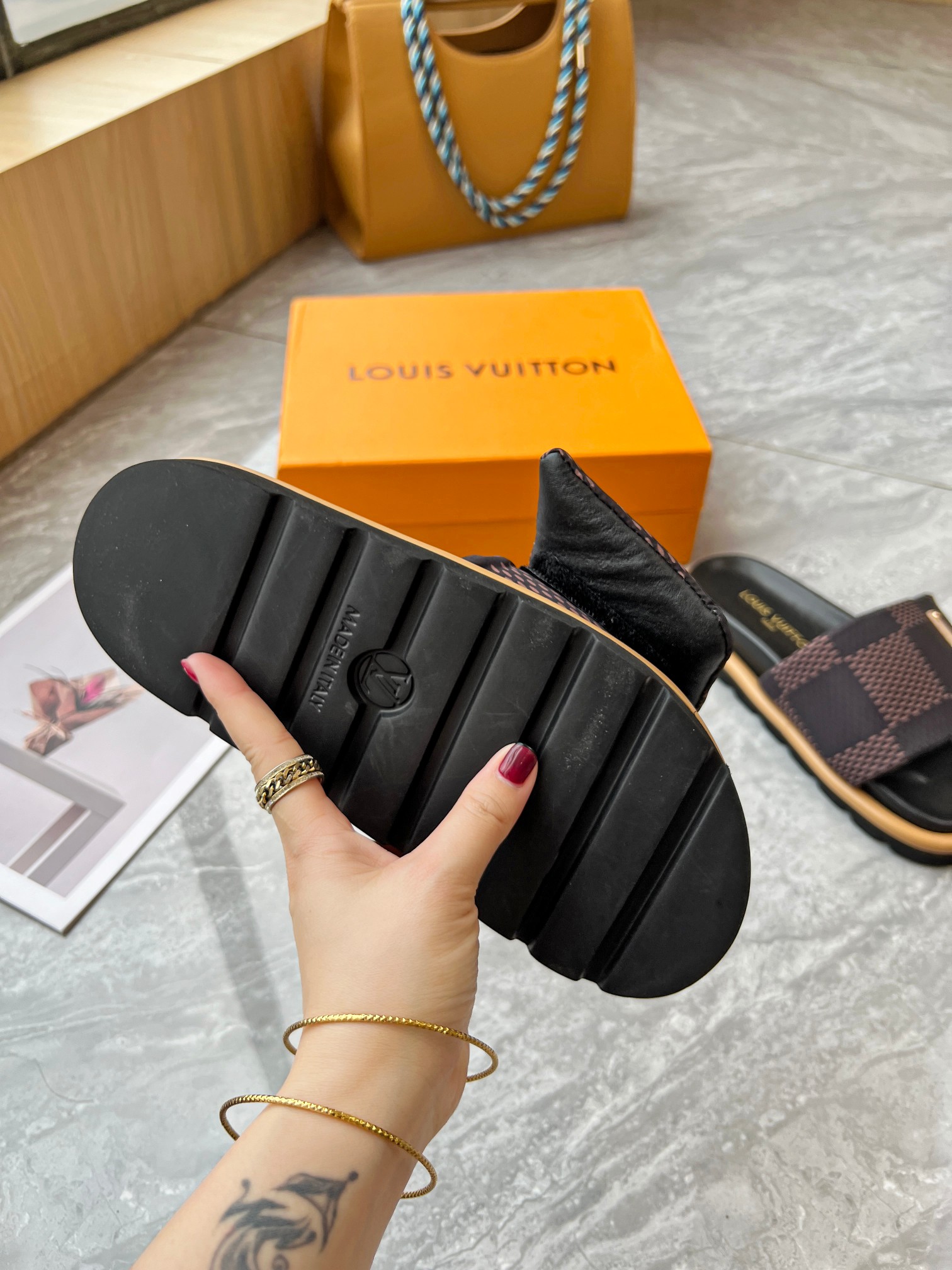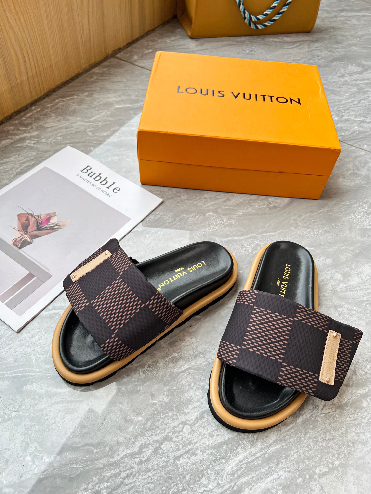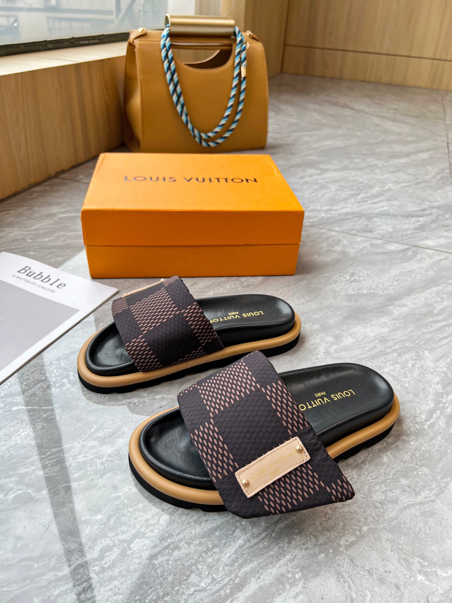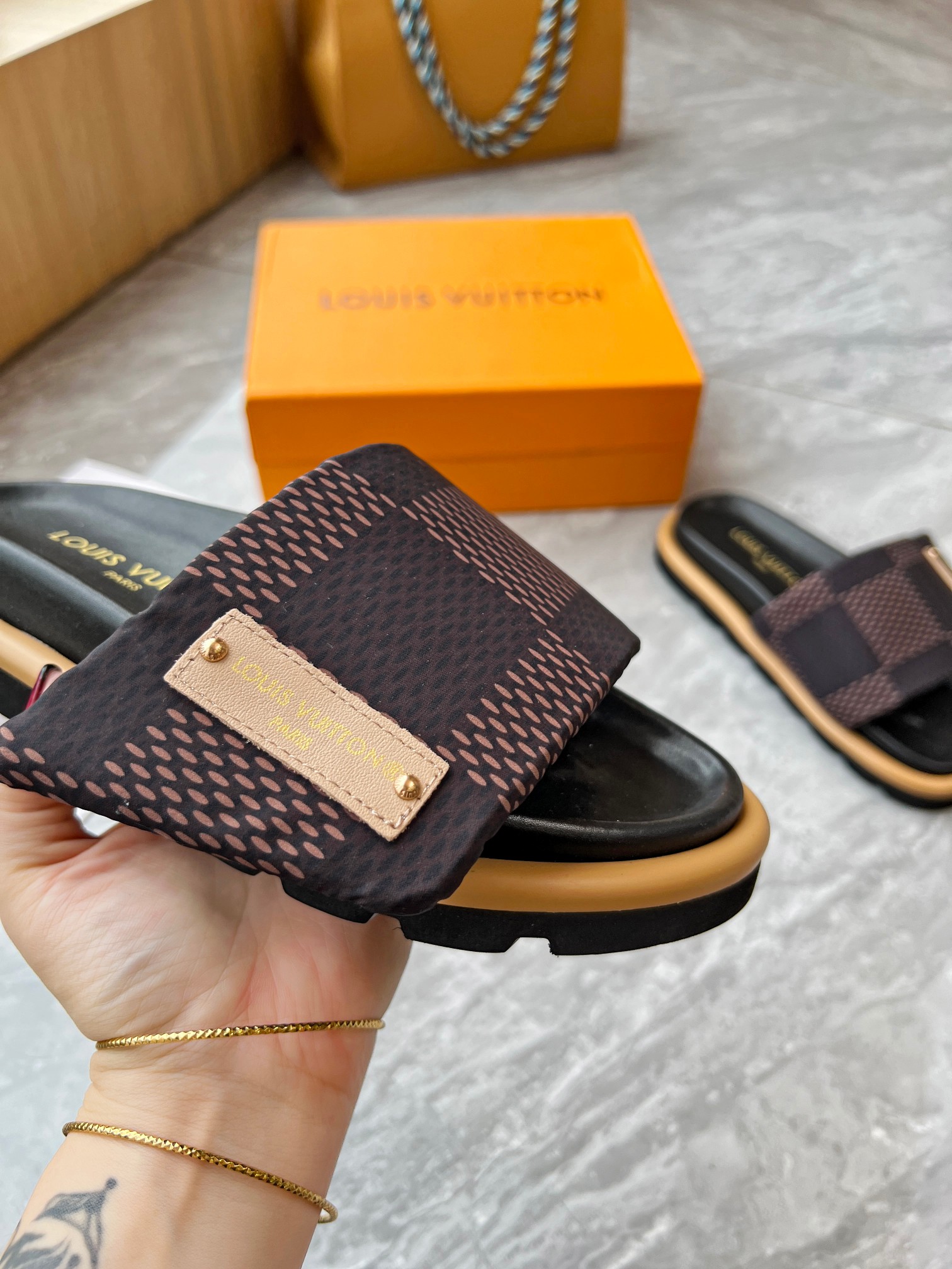 Style #2004??????. L Donkey L Family's best-selling embossed logo patterned flip-flops. This Pool Pillow Comfort flat-bottomed flip-flops is made of technological fabric and reinterprets the Monogram pattern with high-frequency embossing technology. Soft padded upper with adjustable Velcro, comfortable and resilient insole with harmonious color ?? Fabric: Original custom tech fabric ?? Lining: Soft sheepskin ?? Sole: original molded rubber foam outsole ??Size: 35-44 (45.46.47)
