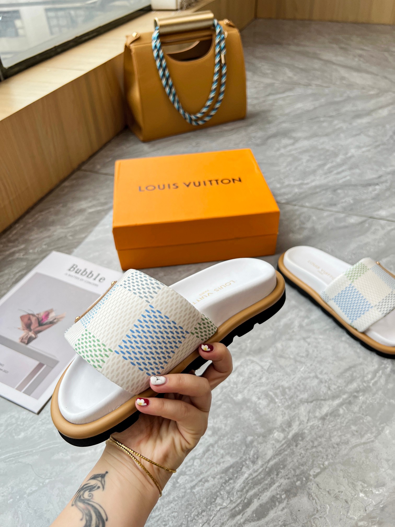 Style #2004??????. L Donkey L Family's best-selling embossed logo patterned flip-flops. This Pool Pillow Comfort flat-bottomed flip-flops is made of technological fabric and reinterprets the Monogram pattern with high-frequency embossing technology. Soft padded upper with adjustable Velcro, comfortable and resilient insole with harmonious color ?? Fabric: Original custom tech fabric ?? Lining: Soft sheepskin ?? Sole: original molded rubber foam outsole ??Size: 35-44 (45.46.47)
