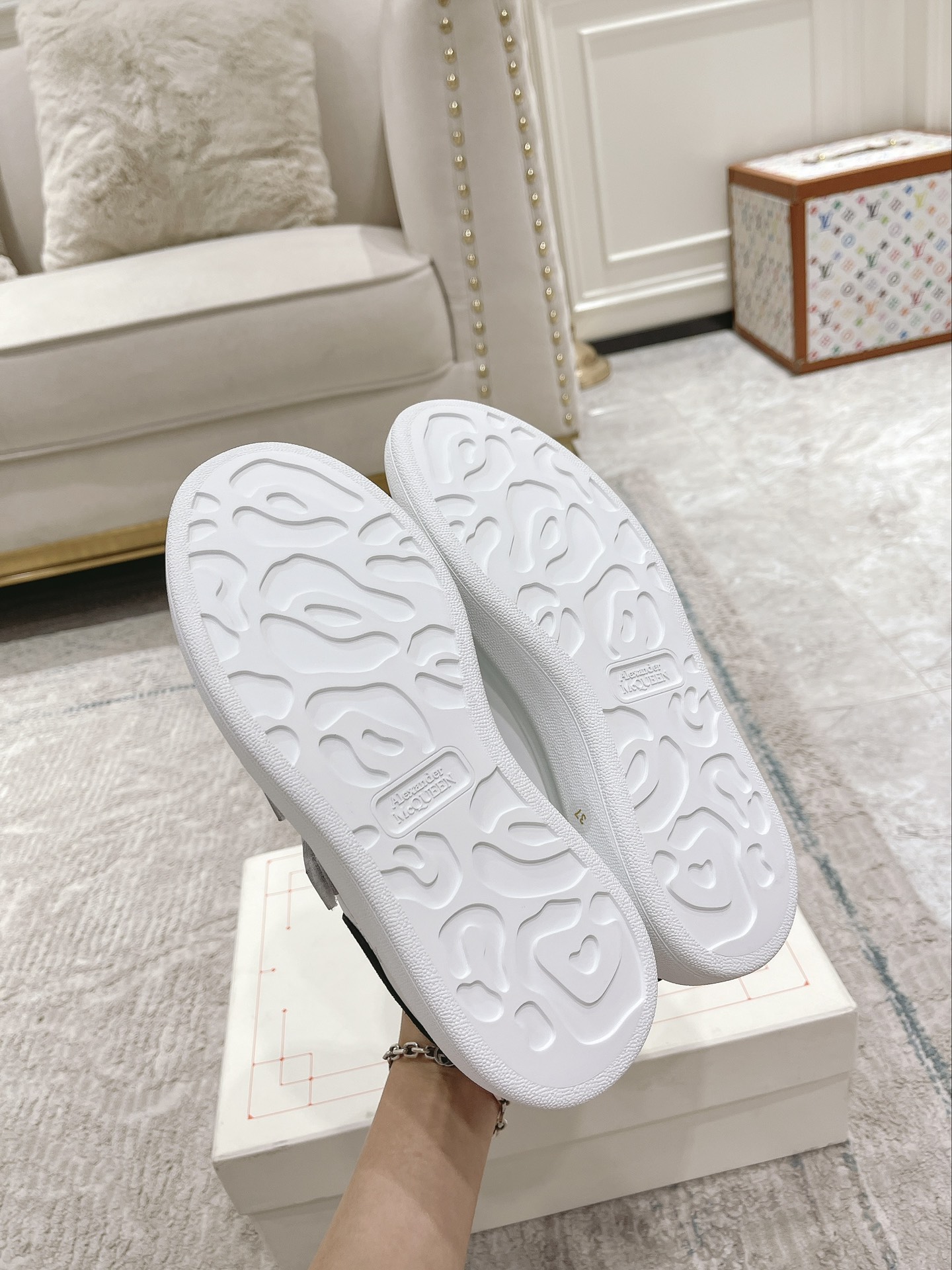 Velcro ?? Alexander McQ?23ss classic white sneakers, made by McQueen for six consecutive years, the newly upgraded version is available at the counter simultaneously The latest original top-tier version developed this year - the couple version ... ?? McQueen M, CQ, as ALWAYS exclusive mold fabric material, LOVE to put down, correct fit, absolutely wonderful to wear, super COMFORTABLE ?????? Our company may not be the earliest to produce bulk goods, but we have always been providing you with the best quality products. We are dedicated to making the best quality! McQueen's top purchasing version for spring, summer, autumn and winter ... ? Classic + FASHION + VERSATILE + GRAND + ELEGANT + HIGH FASHION ???? STAR PREFERRED, ONE of the essential, many color options ??? ?? Fabric: Exclusive molded beige imported silk cowhide The upper of the shoes is custom-made with imported anti-stain features. TPU+PU anti-yellowing. Super strong sense of temperament ?? Lining: imported grade A water-dyed sheepskin (price equal to cowhide lining) ?? Sole: Counter original mold rubber TPU sole The thick-bottomed 4.5cm men's and women's grinding tools have different lasts ?? with counter original publication (original beige shoebox.) Cloth bag. Handbag. 4-piece set with 1:1 mold for matching certificate. Deliver a pair of shoelaces ?? For men and women size: 35-40 for females, 39-44 for males (Size change only) 102034 [Male size plus 10] Note: Special sizes: Female 34.40.41, male 38.45.46. Custom-made available. Return. Exchange McQueen's tail has too many colors. Special style, special color, special tail. The air cushion series Velcro is custom-made and non-returnable. It's normal for the tail fabric of the colored style to have some differences in light and dark colors. Thank you [handshake][Handshake][Handshake]