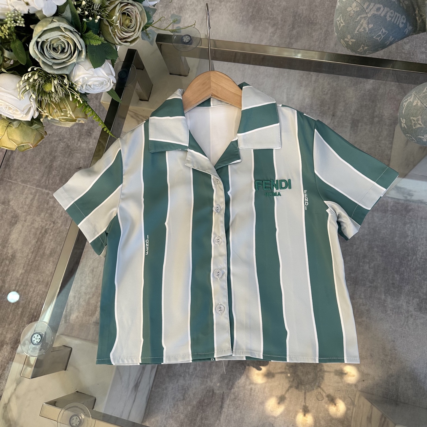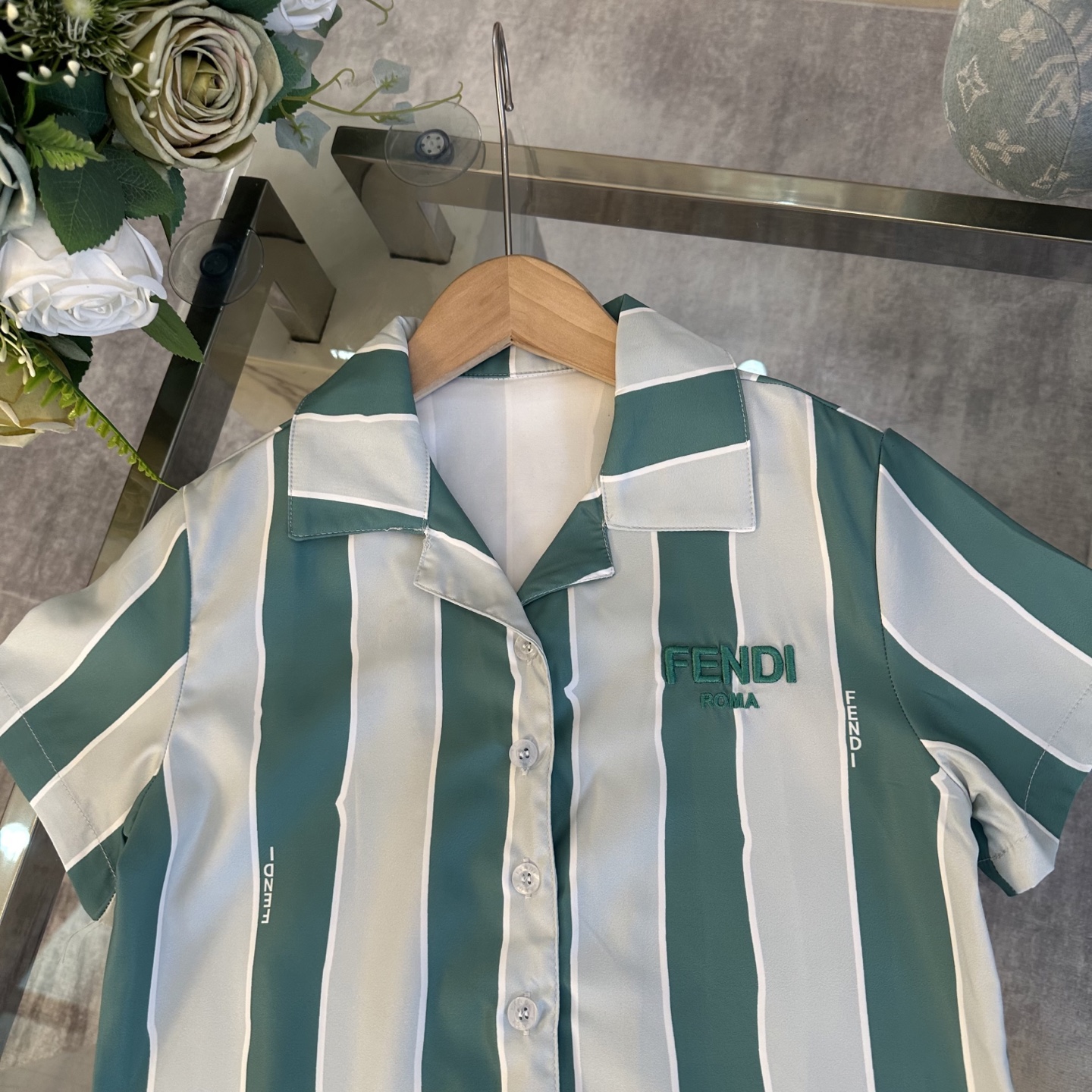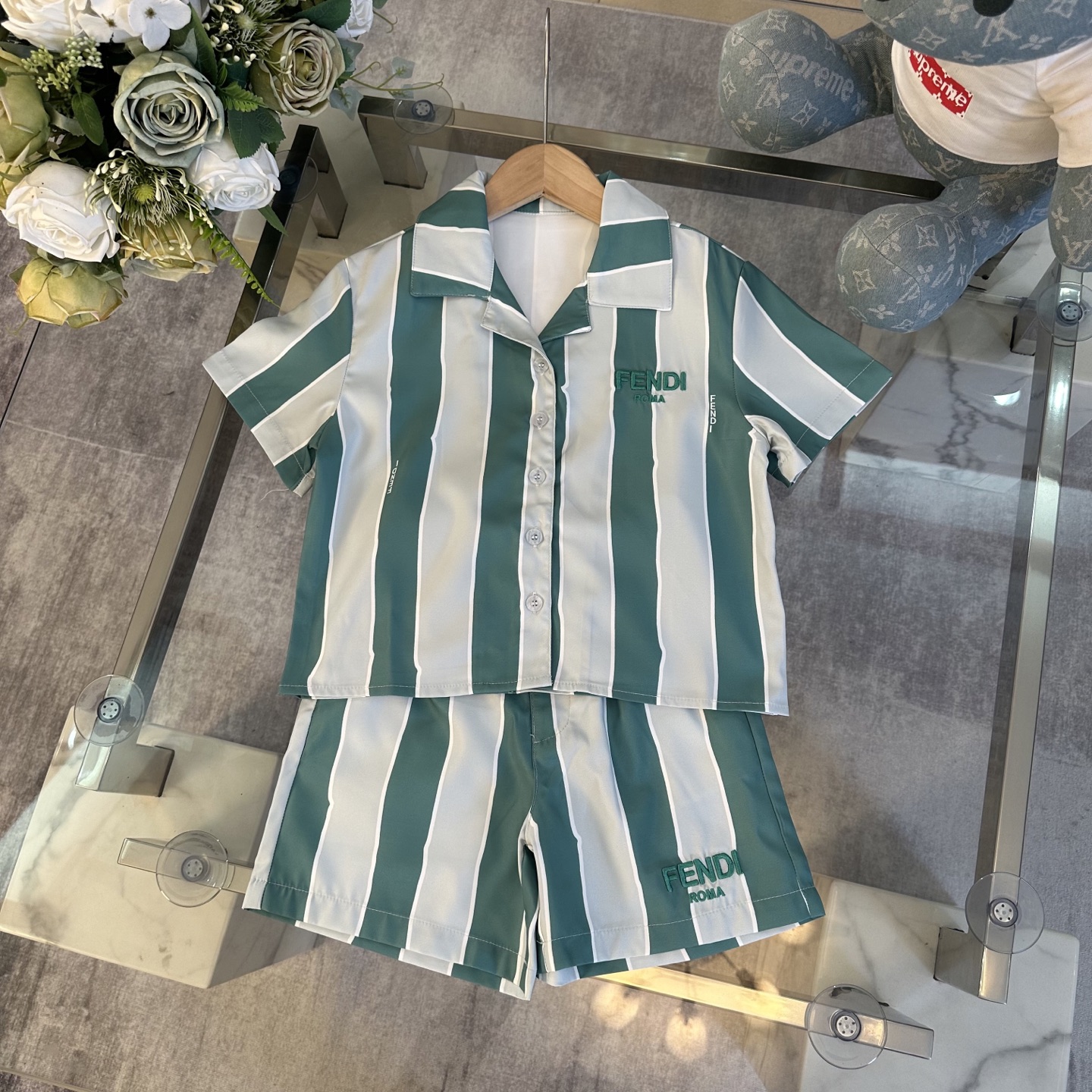 Fendi, high-end children's wear, private suit, stripe color polo shirt ? waist shorts, show white color and pure and fresh, languid is lazy vacation wind, custom stripe color fabrics, upper body comfortable, good-looking, code number: 100/110/120/130/140/150 cm