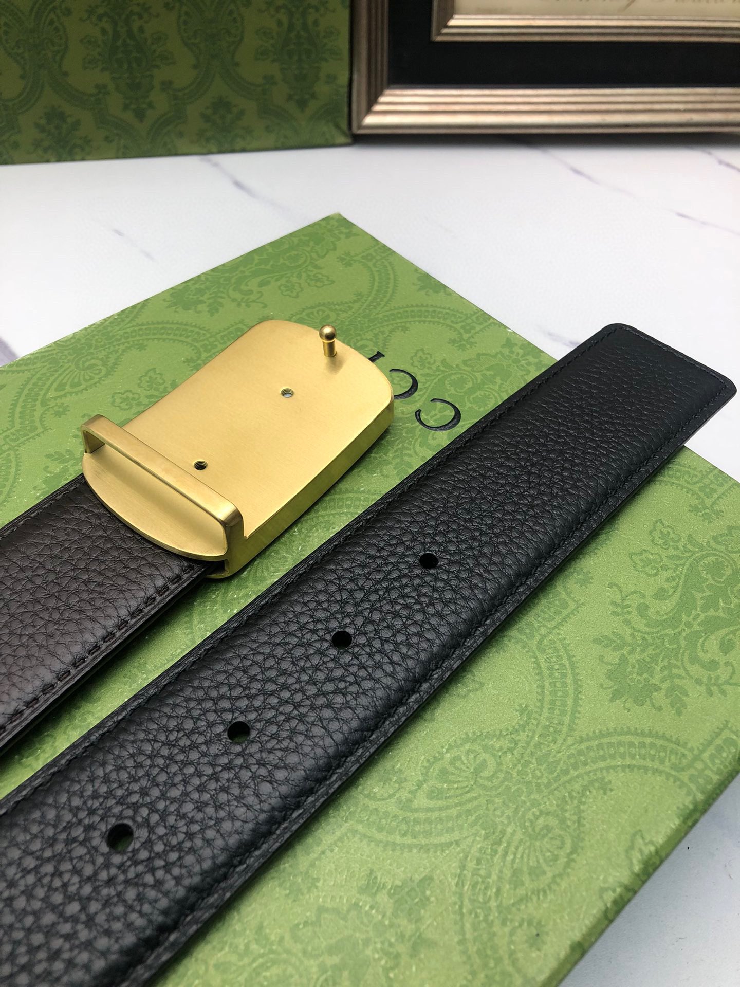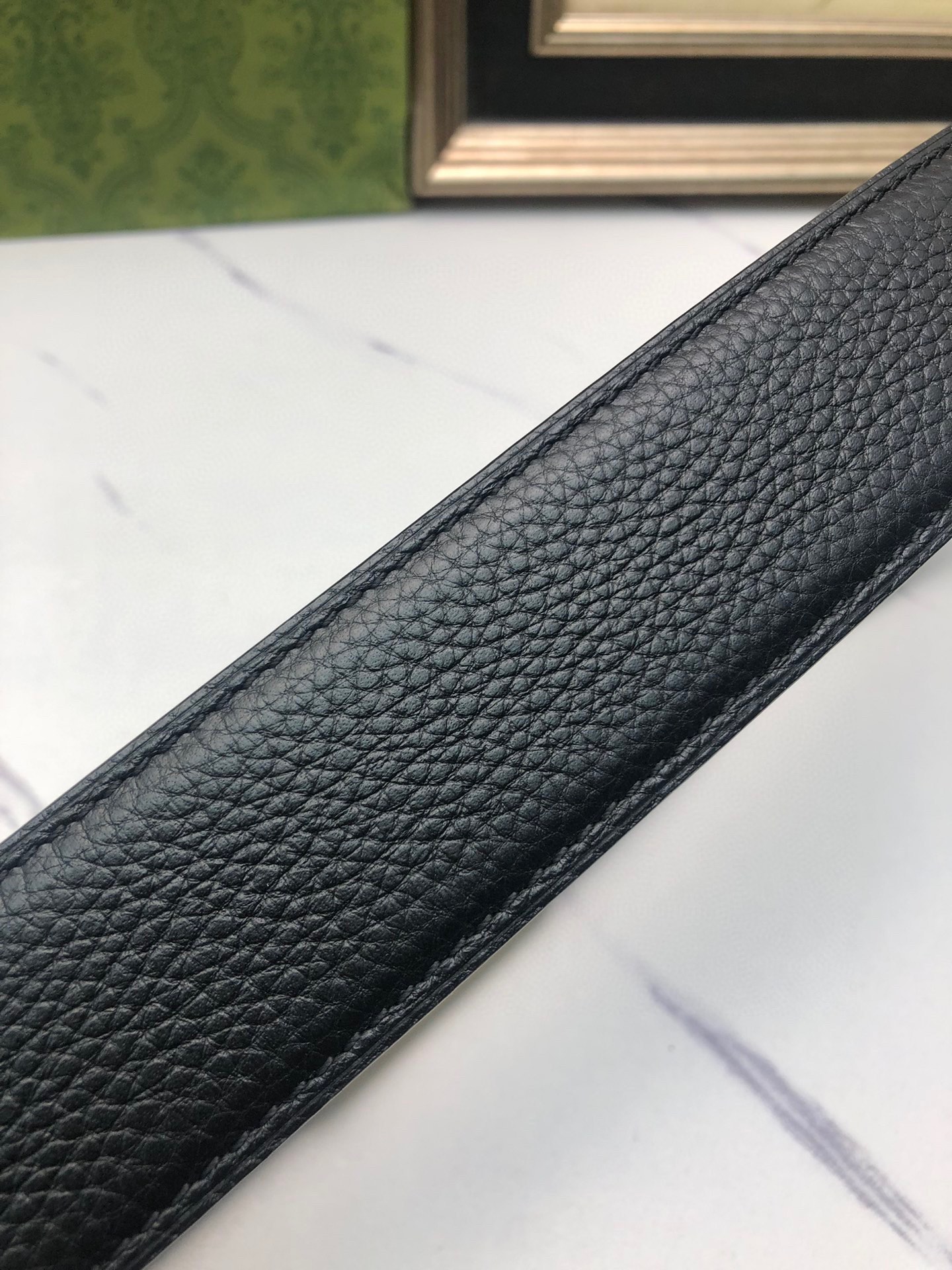 Gucci: Original single and double-sided top-grain cowhide with lychee pattern. Black and brown in one piece, suitable for both the front and back sides, and paired with a rigid buckle. Original leather custom-made, counter width 3.8