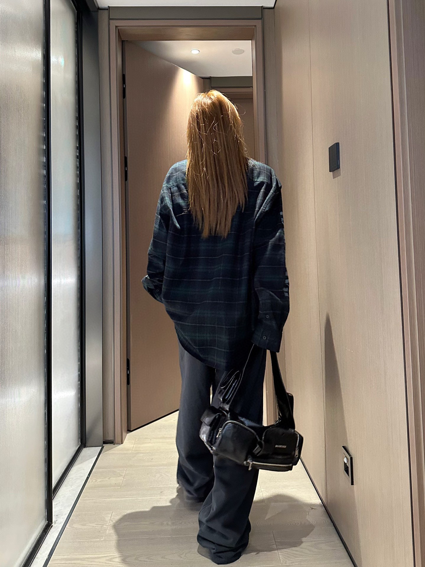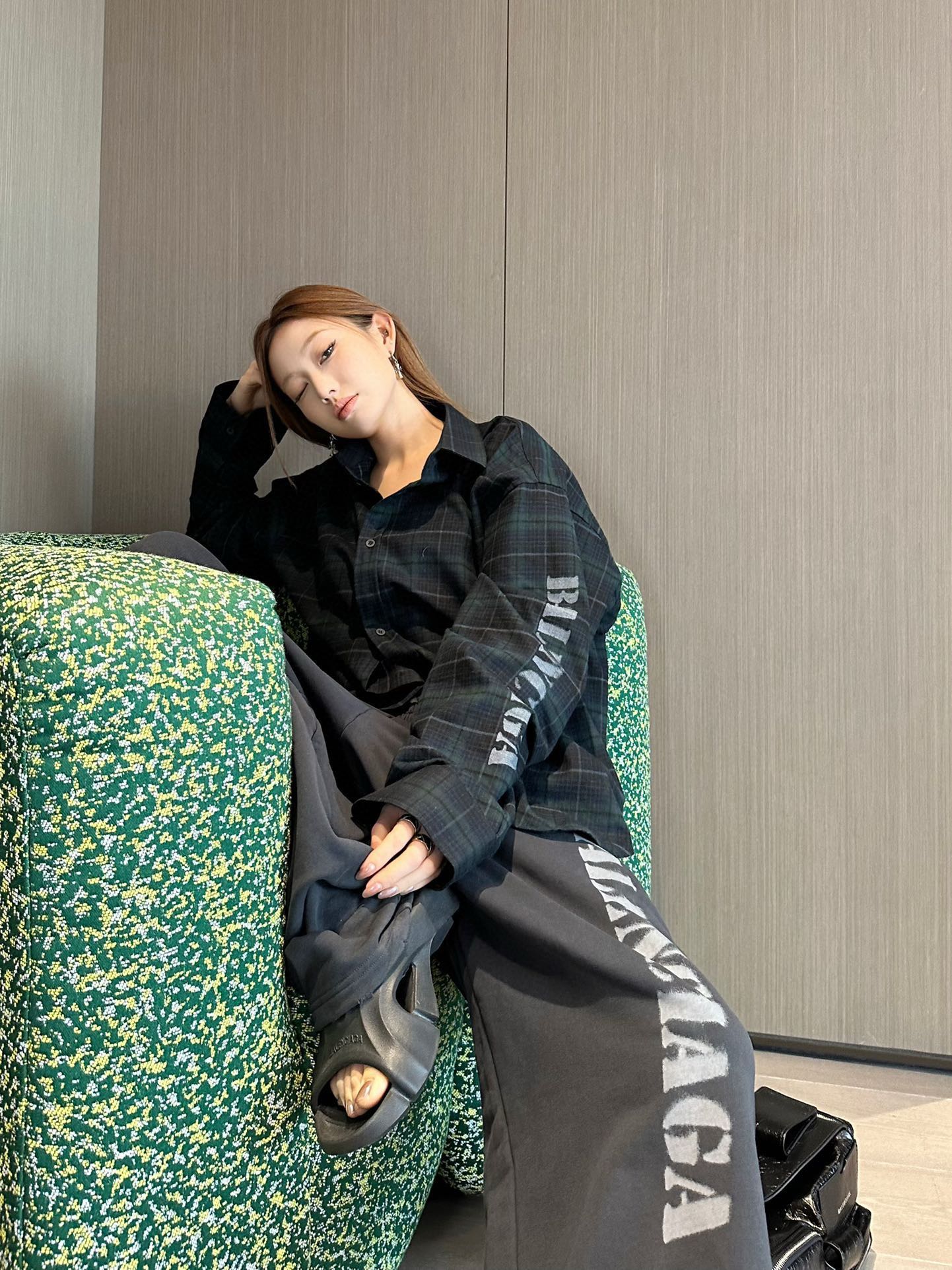 The wearing effect of Balenciaga/ Parisian Family blurry letter check long-sleeved shirt #